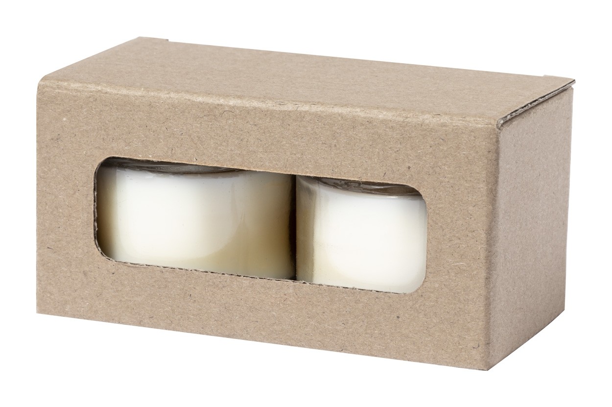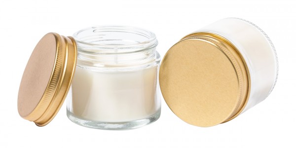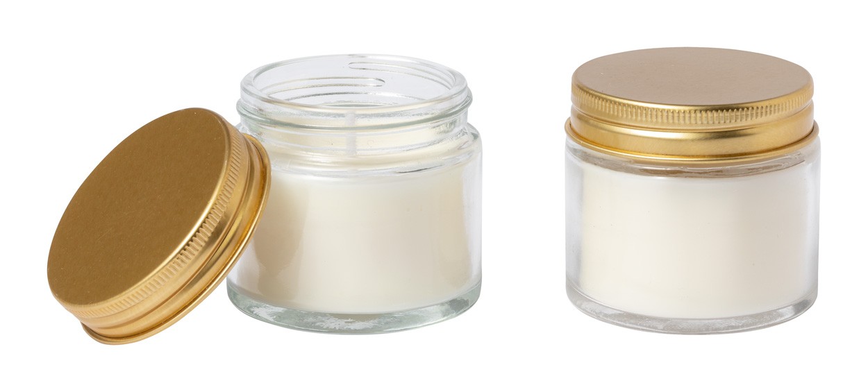 Set 2 buc lumânări parfumate, de ceară pe bază de plante, în borcan de sticlă cu capac metalic. În cutie de hârtie kraft.