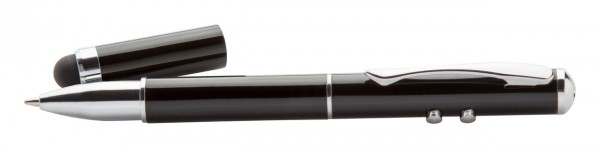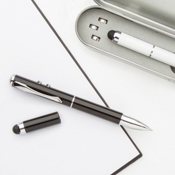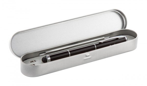 Pix laser pointer multifuncțional, cu vârf tuch screen și cu LED, în cutie metalică. Se livrează cu mină albastră și baterii.