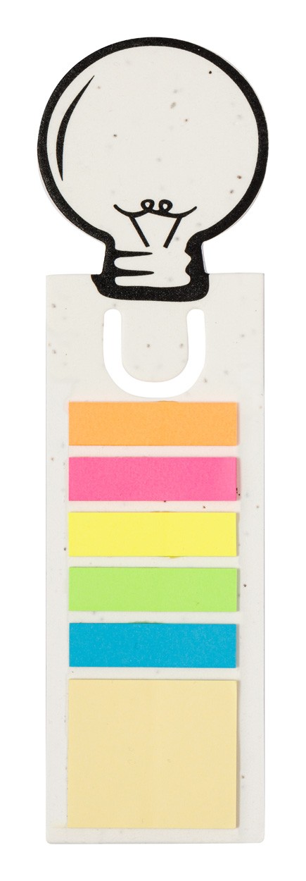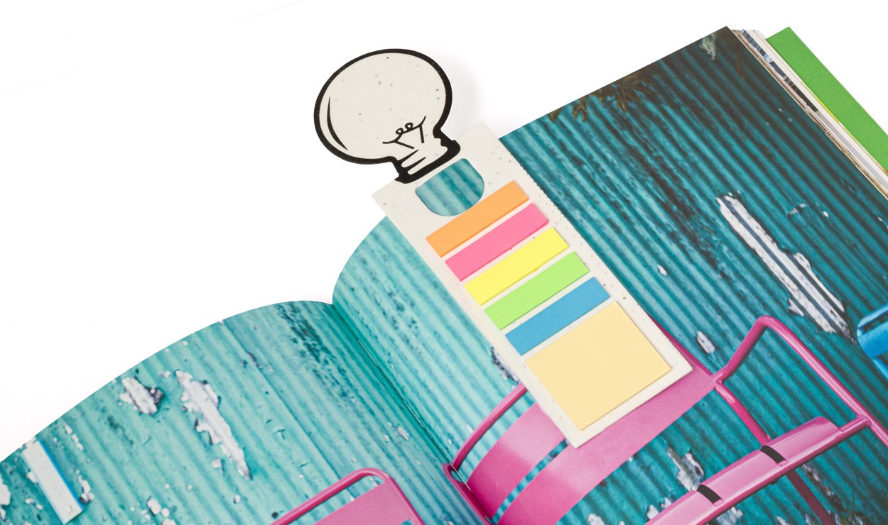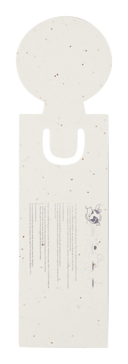 Semn de carte din hârtie cu semințe, cu 15 note adezive și 75 de markere de pagină (în 5 culori diferite). Semnul de carte din hârtie cu semințe conține semințe de petunia în culori asortate, care pot fi plantate prin separarea semnului de carte de notele adezive.