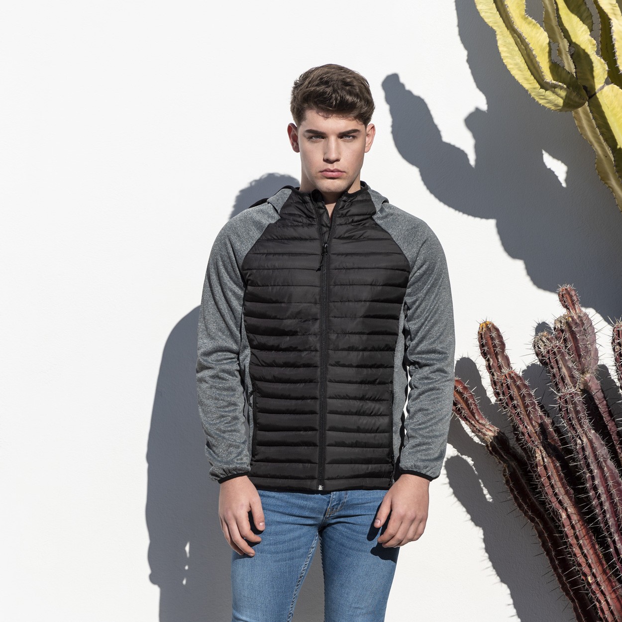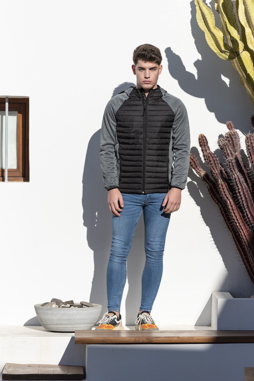 Jachetă respirabilă, rezistentă la vânt și la apă, cu fermoar, în combinație softshell-poliester, cu glugă și buzunare laterale cu fermoar.