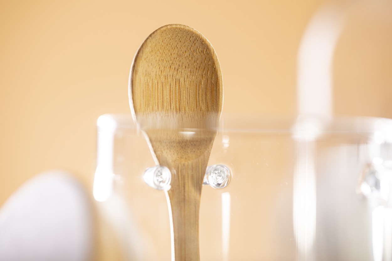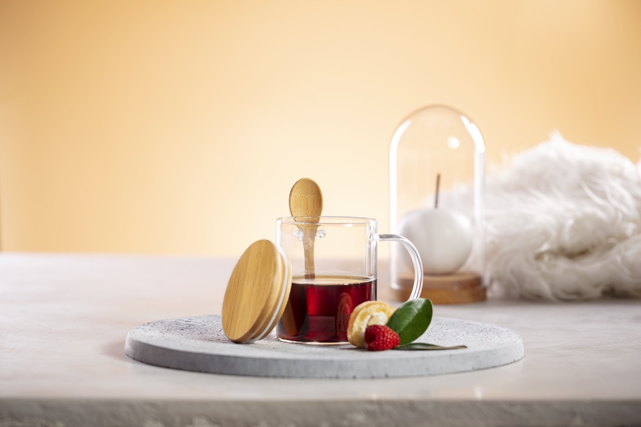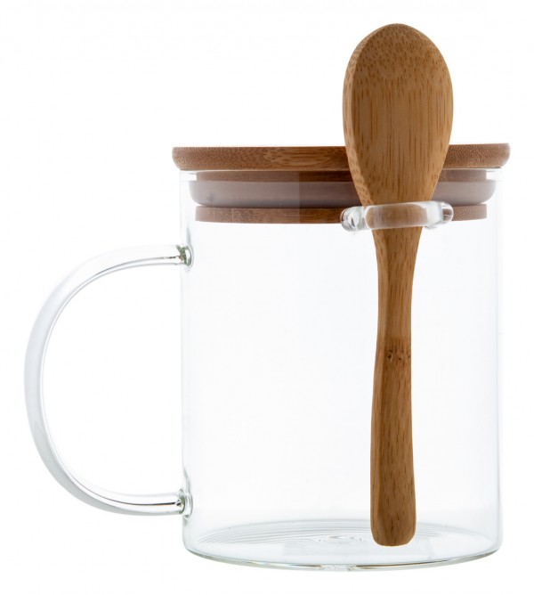 Cană din sticlă borosilicată cu capac și lingură din bambus, 420 ml. În cutie de hârtie kraft.