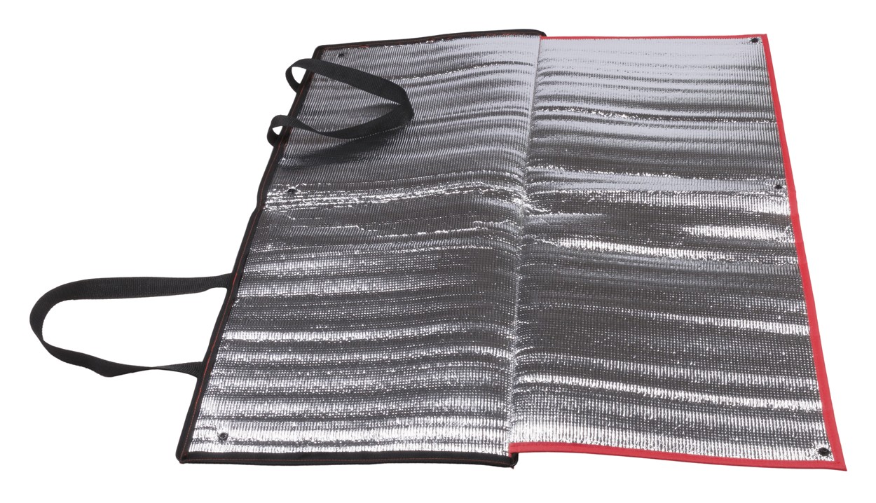 Geantă termoizolantă cu fermoar, cu căptușeală din aluminiu, poliester 600D. Poate fi folosită ca o păturică de picnic.