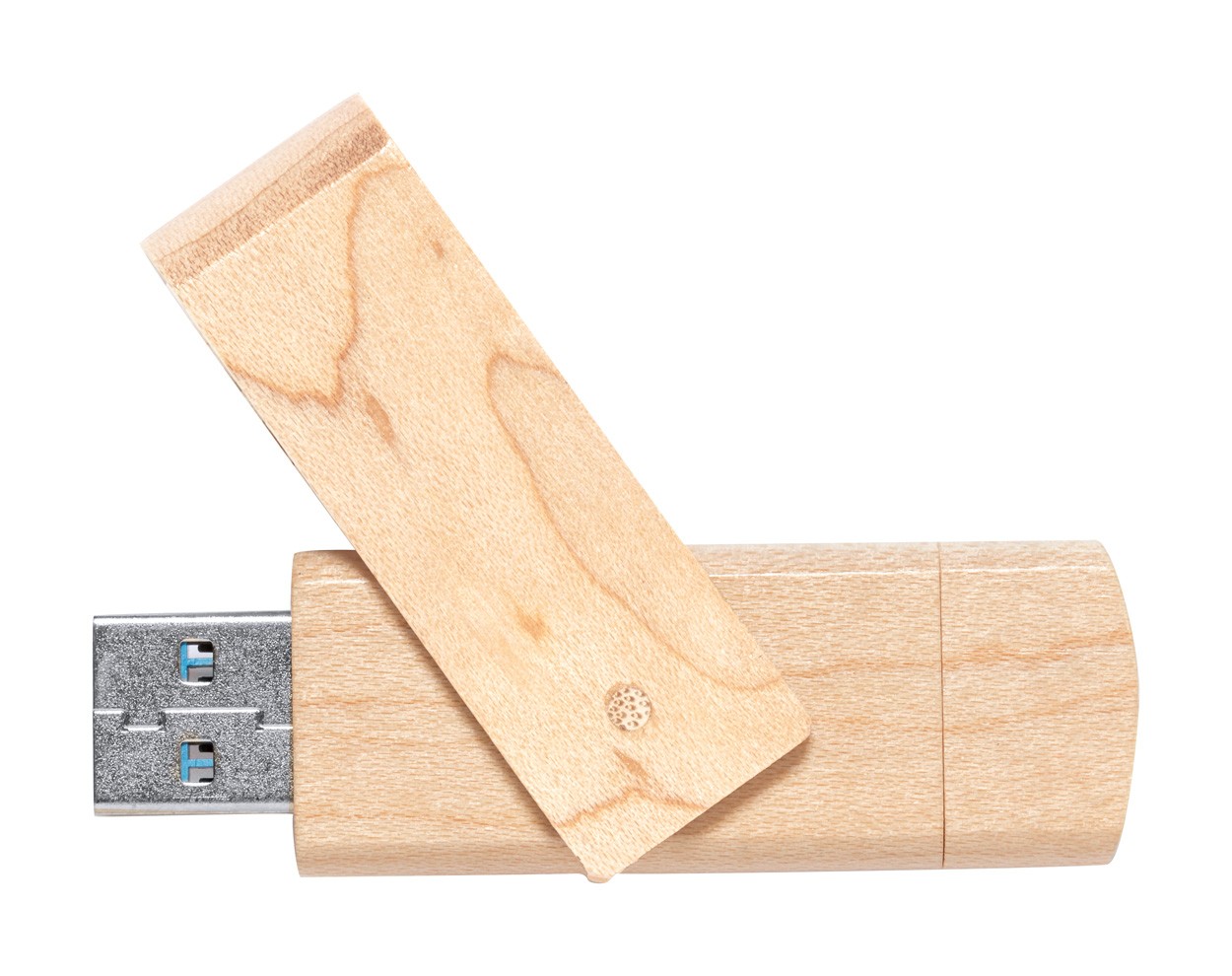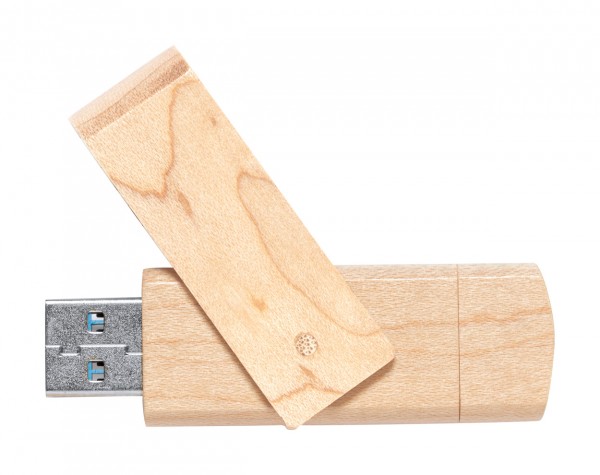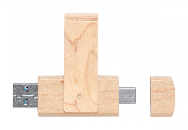 Twist OTG USB flash drive in wooden housing with 16 GB memory. With USB and USB-C connections. In recycled kraft paper box. USB 2.0.