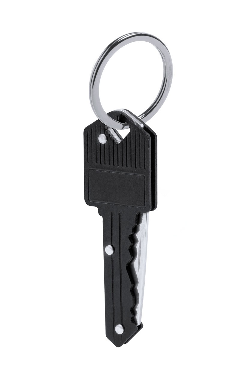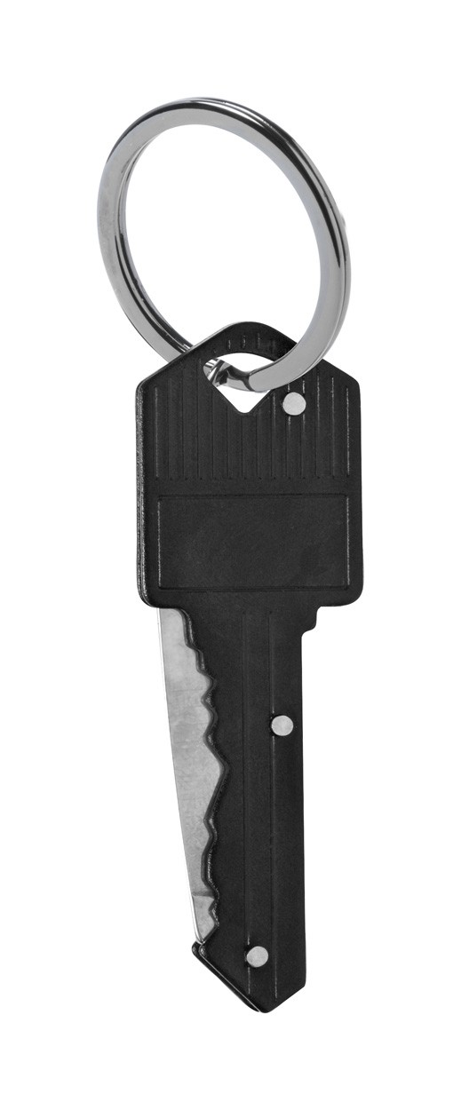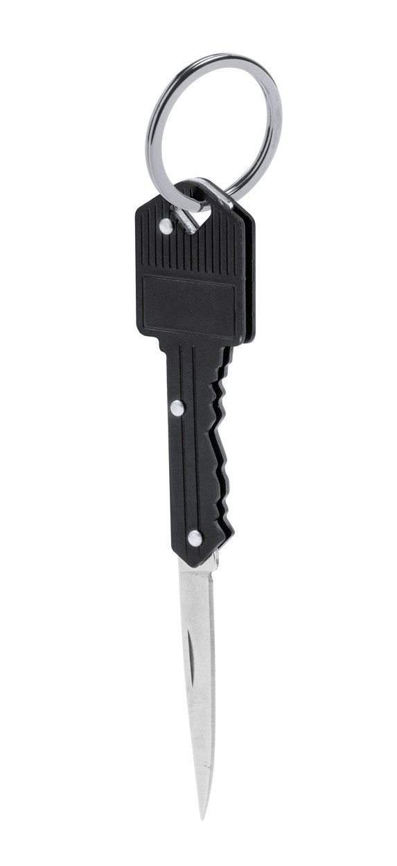 Key shaped pocket knife in aluminium and stainless steel, with keyring.