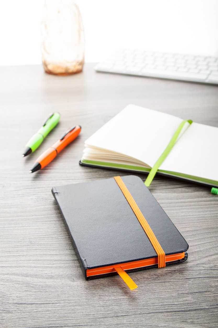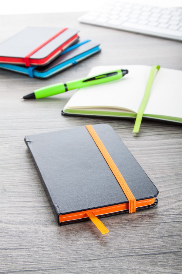 Carnețel cu 80 file veline, cu semn de carte și elastic colorat.