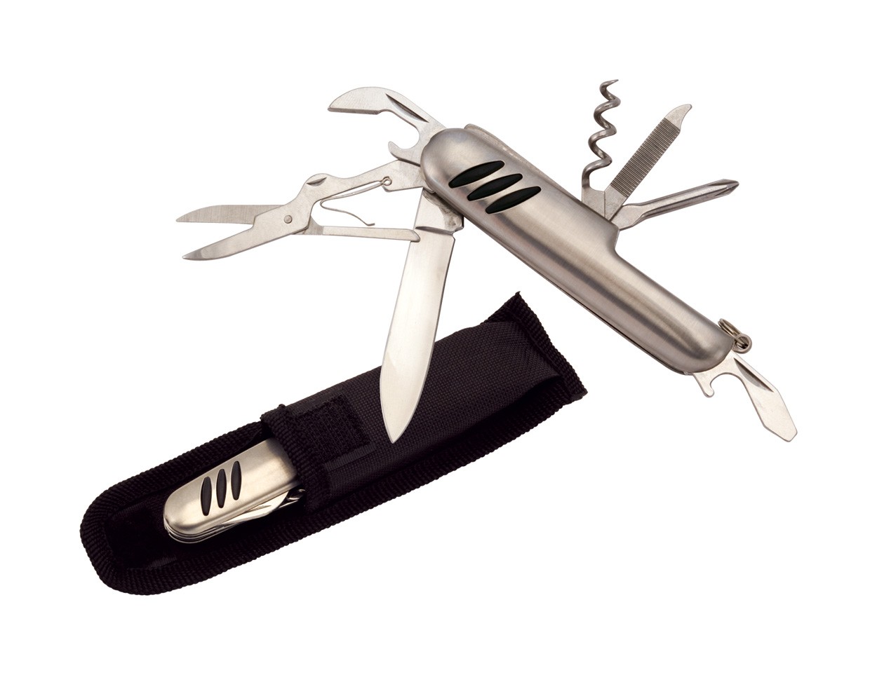 Briceag multifuncţional din oţel inoxidabil, 9 funcţii, în husă neagră.