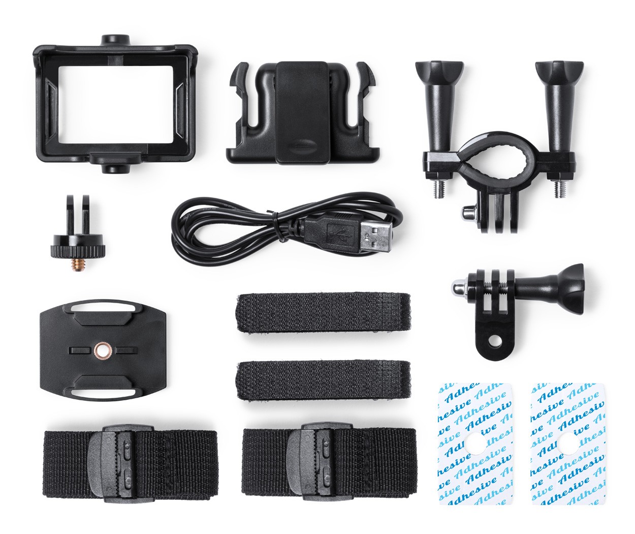 Cameră video sport din plastic, cu rezolutie HD 720p, 2 ", ecran LCD și baterie reîncărcabilă. 14 accesorii și cablu de încărcător USB.
