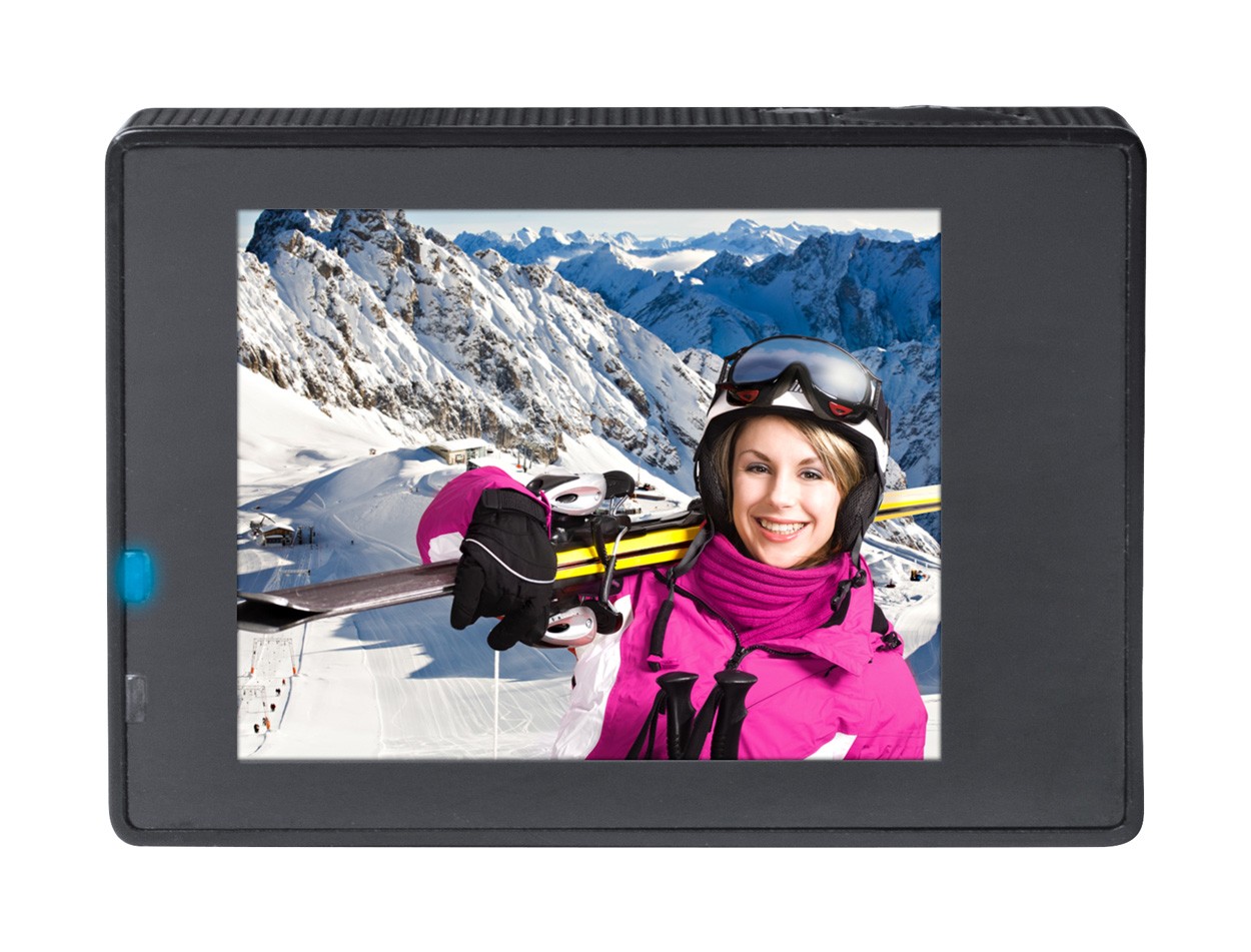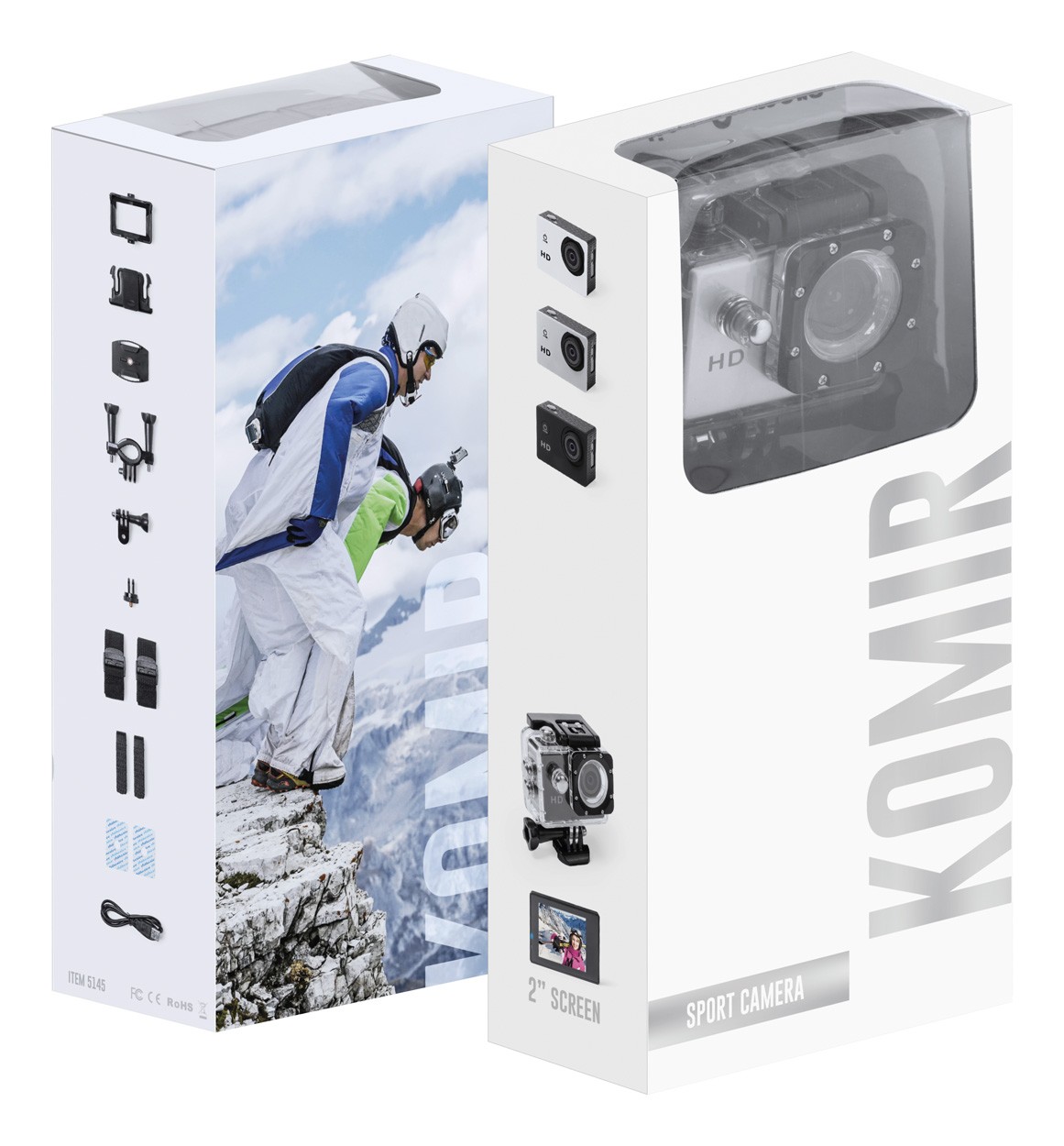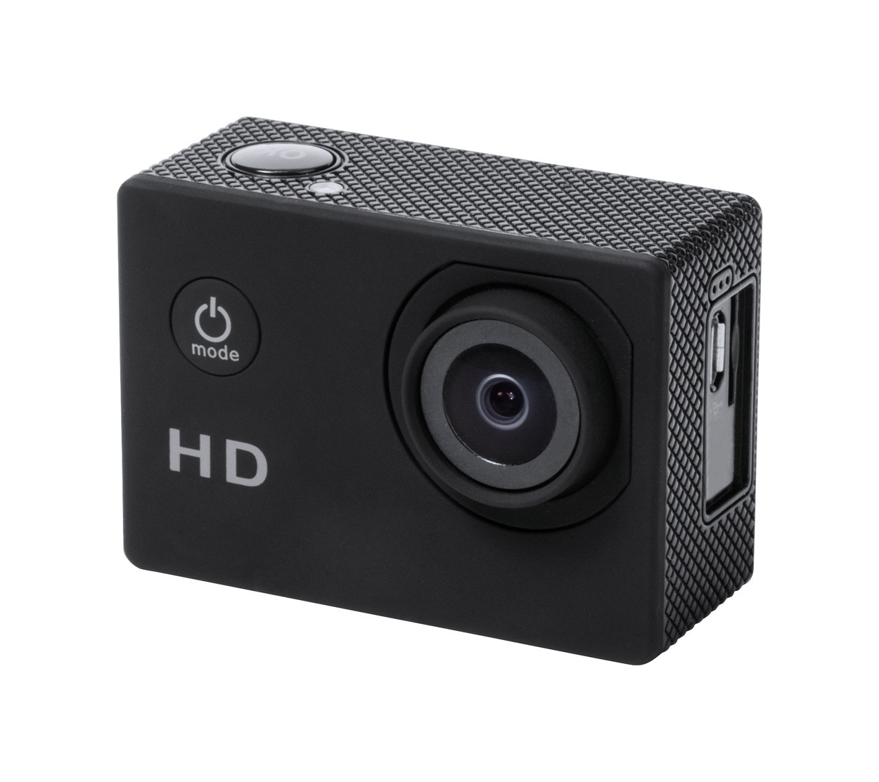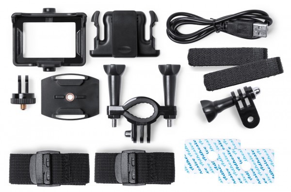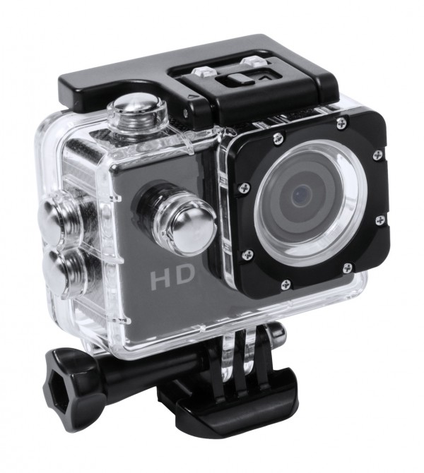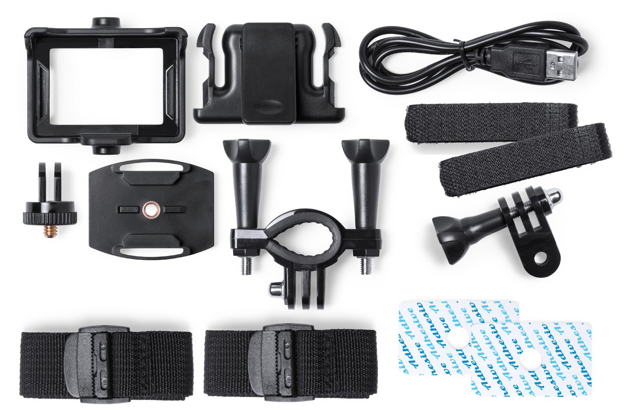 Cameră video sport din plastic, cu rezolutie HD 720p, 2 ", ecran LCD și baterie reîncărcabilă. 14 accesorii și cablu de încărcător USB.