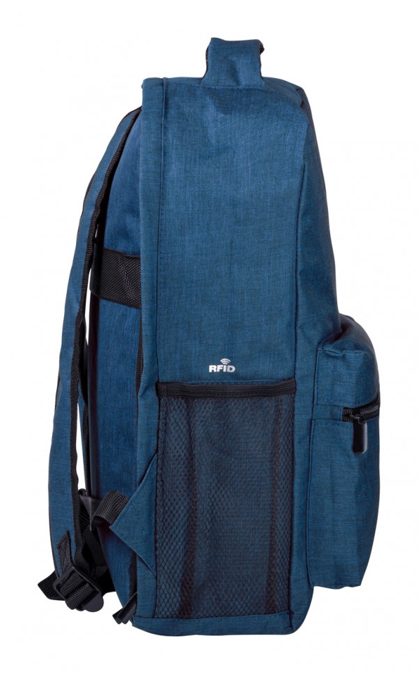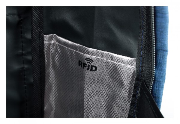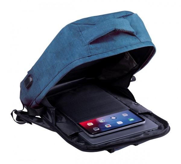 Rucsac antifurt cu RFID, mai multe compartimente cu fermoar, compartimente căptușite pentru laptop și tabletă, cu spate și bretele întărite . Port USB încorporat pentru power bank. Poliester 300D.