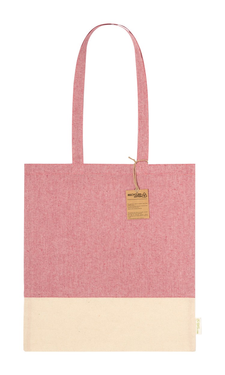 Sacoșă de cumpărături, din bumbac reciclat bicolor, cu mânere lungi și etichetă distinctivă din bumbac reciclat. 100% bumbac reciclat, 120 g/m².