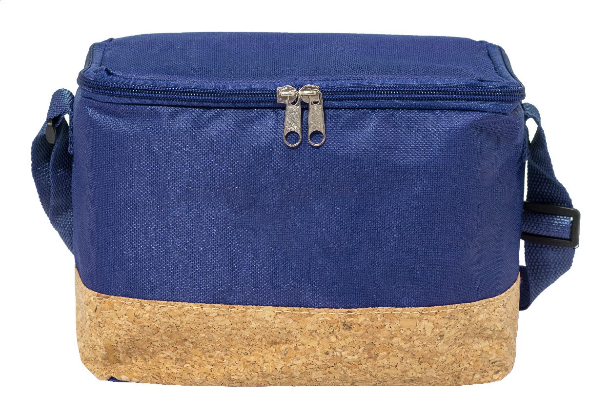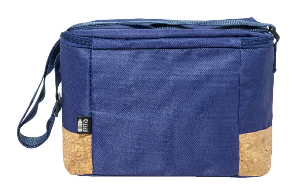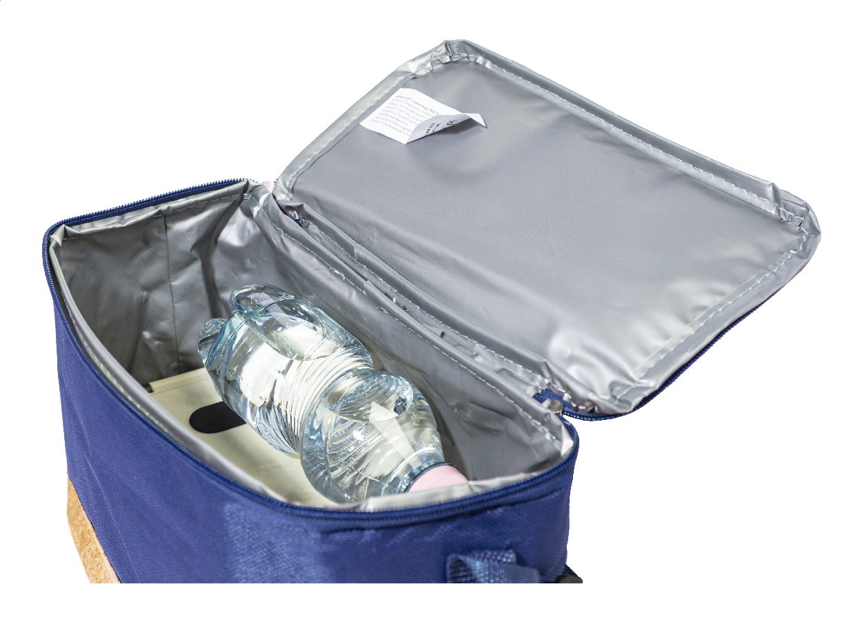 Geantă frigorifică cu fermoar, din poliester 600D RPET, cu bază din plută naturală, căptușeală PEVA și curea de umăr reglabilă. Cu etichetă distinctivă RPET.