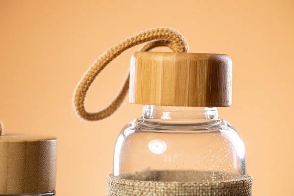 Sticlă din sticlă, cu husă din poliester de culoare naturală, capac din bambus și curea de transport, 500 ml. Nu este potrivită pentru băuturi carbogazoase.