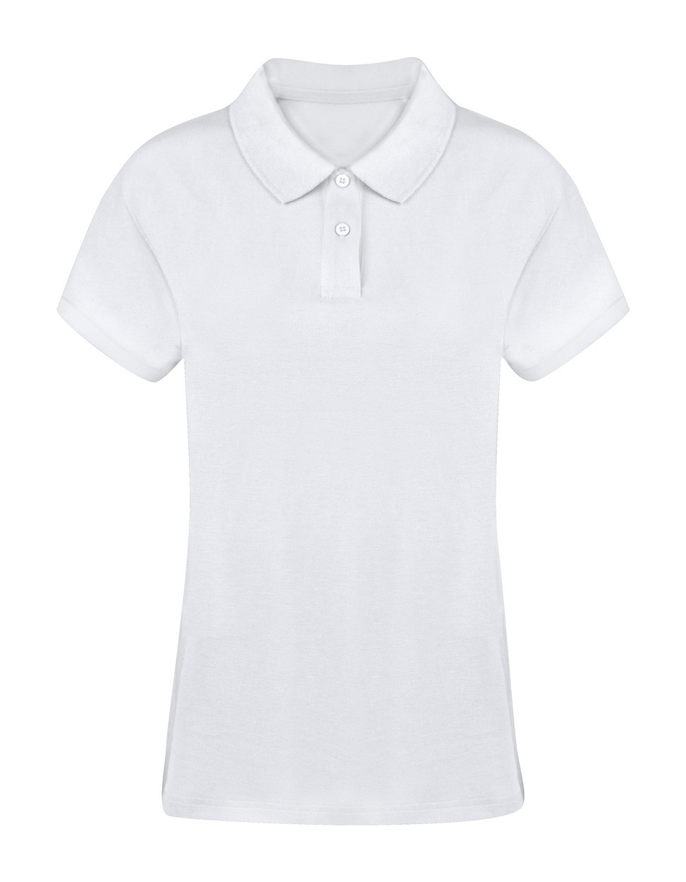 Tricou polo alb piqué, de damă, cu doi nasturi de culoare asortati. 100% bumbac ringspun, 220 g/m².