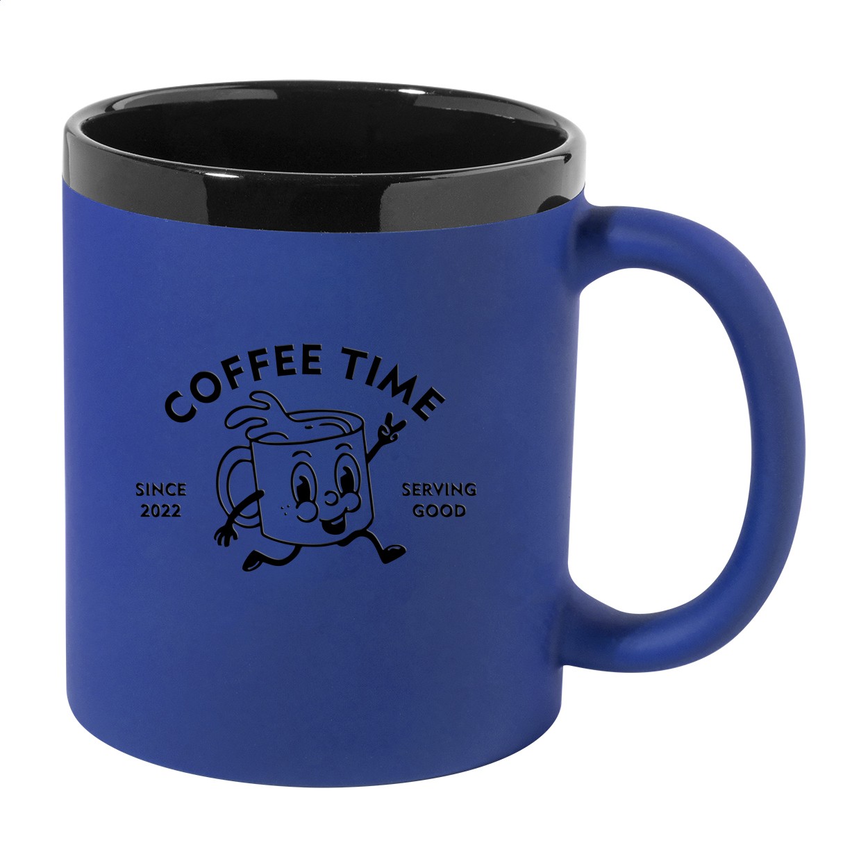 Cana din ceramică, cu finisaj cauciucat moale la atingere și interior și margine negre, 300 ml. Cu acoperire specială pentru gravare, logo-ul gravat se potrivește cu culoarea interiorului. În cutie din hârtie kraft.