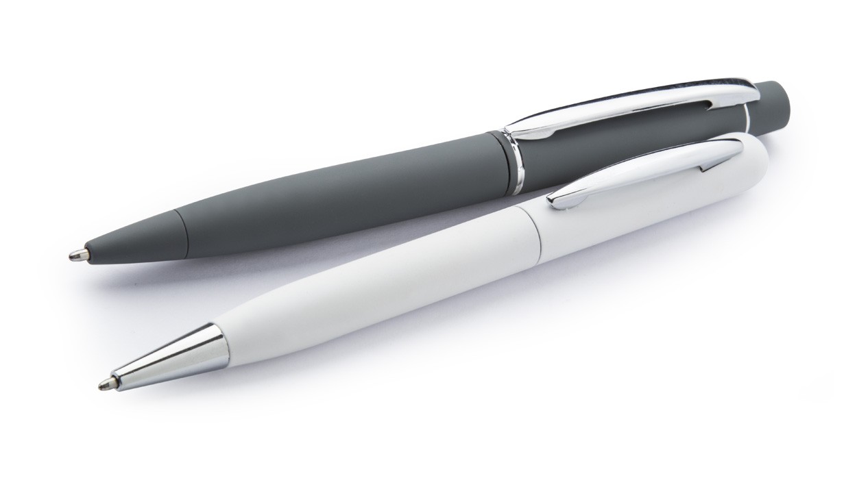 Pix metalic cu deschidere prin răsucire, cu finisaj cauciucat și mină albastră.