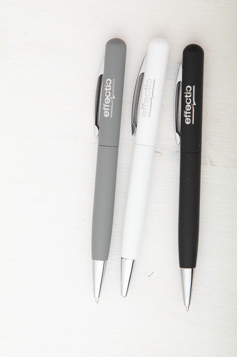 Pix metalic cu deschidere prin răsucire, cu finisaj cauciucat și mină albastră.