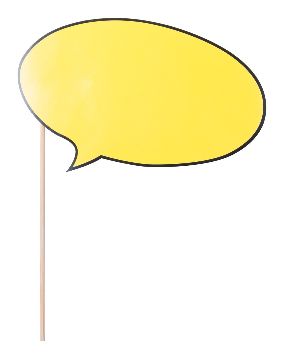 În formă de bulă de dialog, din carton, mâner din lemn.