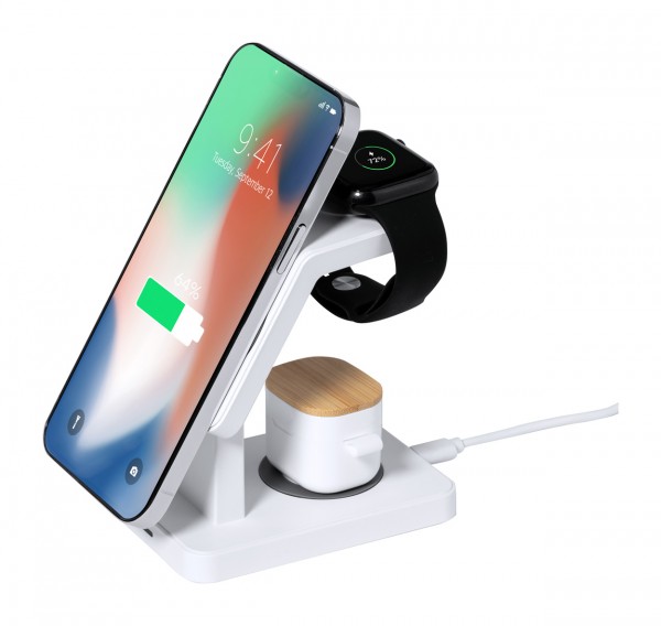 Încărcător rapid fără fir (15W) din plastic, cu suport pentru smartphone, căști și smartwatch. Inclusiv cablu de încărcare USB.