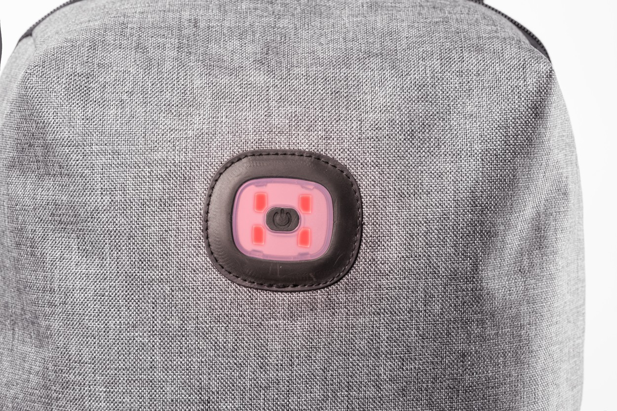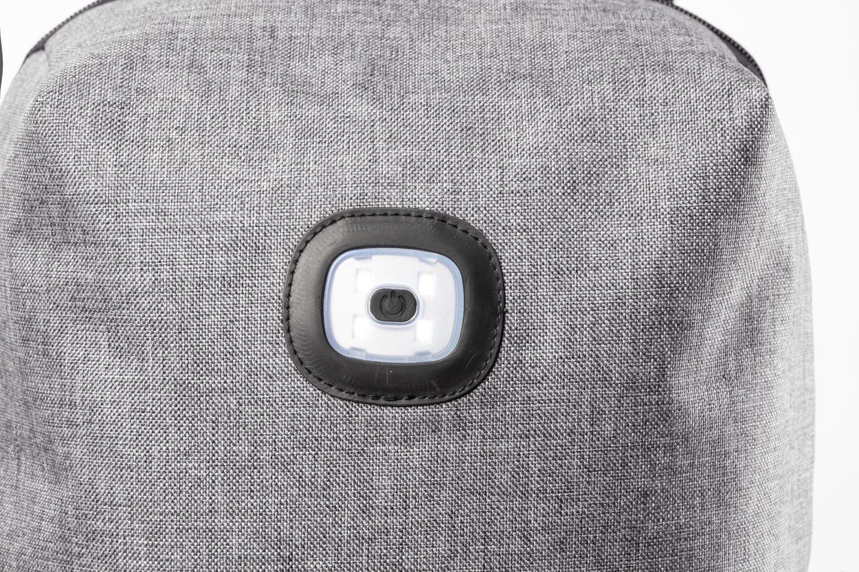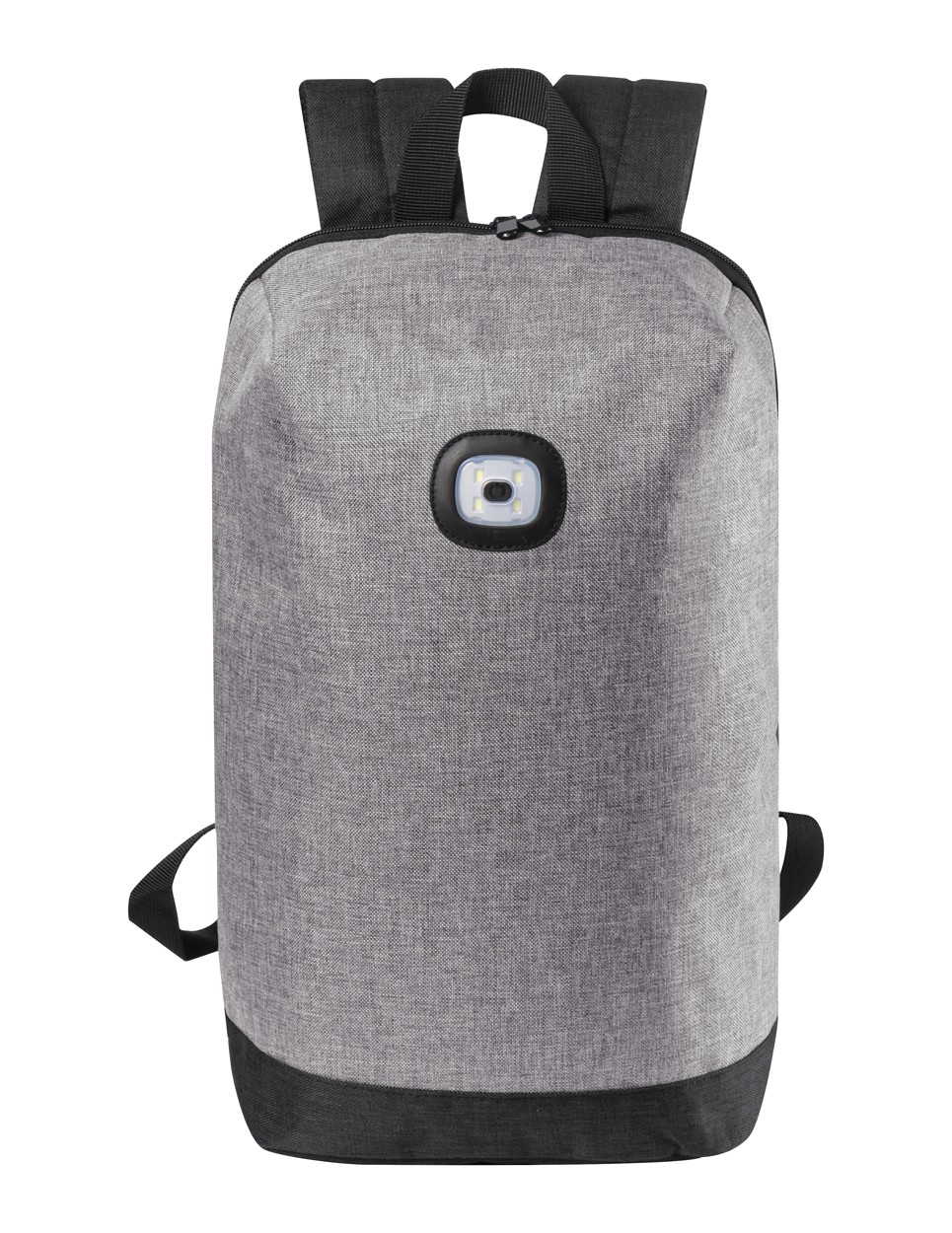 Rucsac cu fermoar, cu lumină LED încorporată, spate și bretele căptușite. Cu 4 leduri și 3 moduri de lumină. Baterii buton incluse. Poliester 600D.