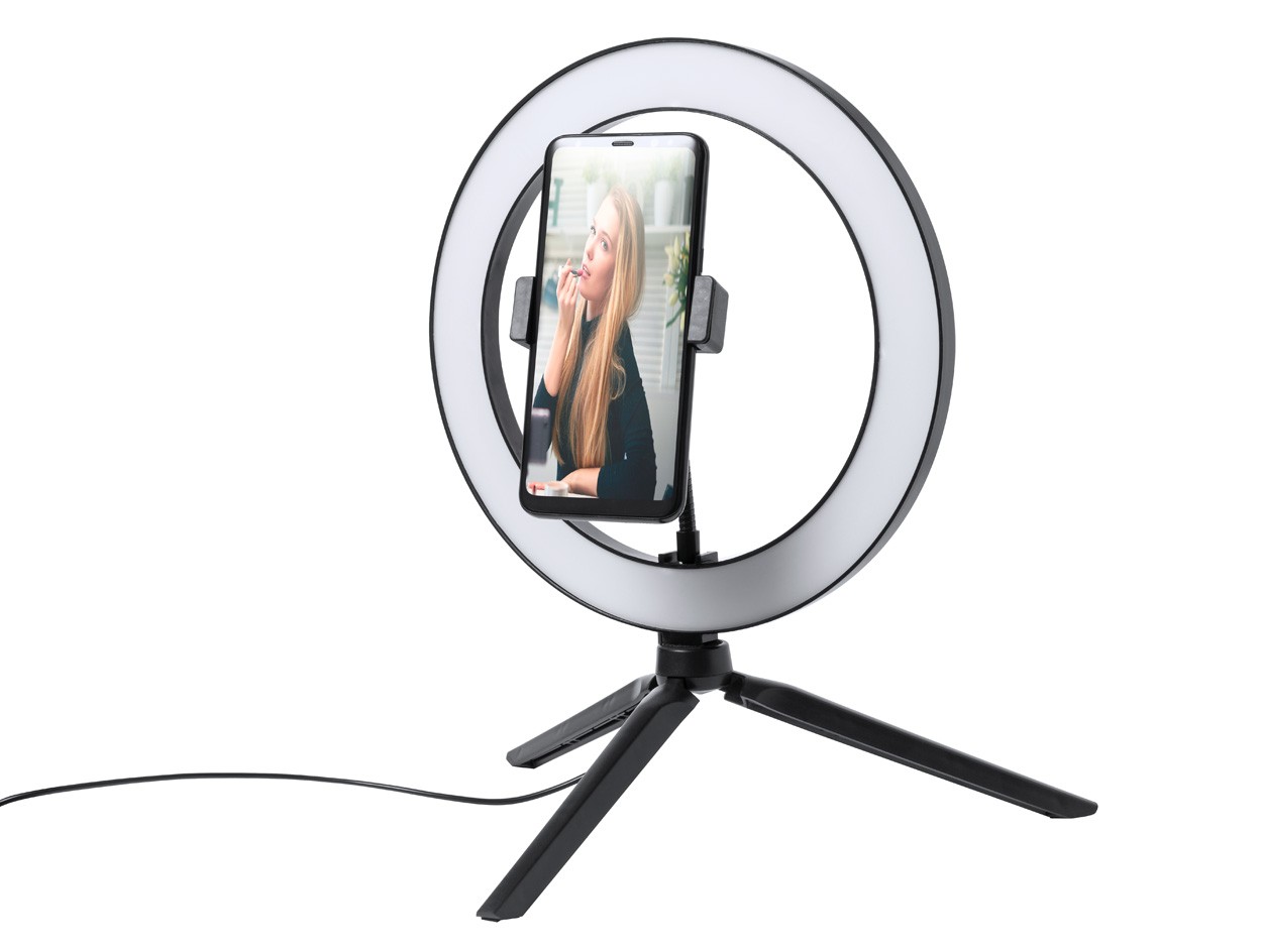 Lumină inel pentru selfie cu trepied reglabil și suport pentru orificii. Cu 120 de LED-uri și luminozitate reglabilă. Inclusiv cablu de încărcare USB.