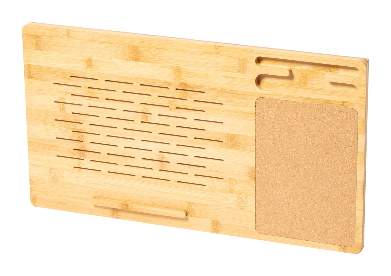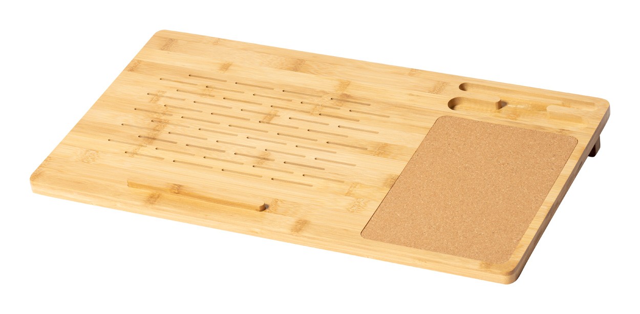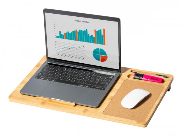 Birou pentru laptop, din bambus, cu suport incorporat pentru telefon mobil și tabletă și mousepad din plută naturală.