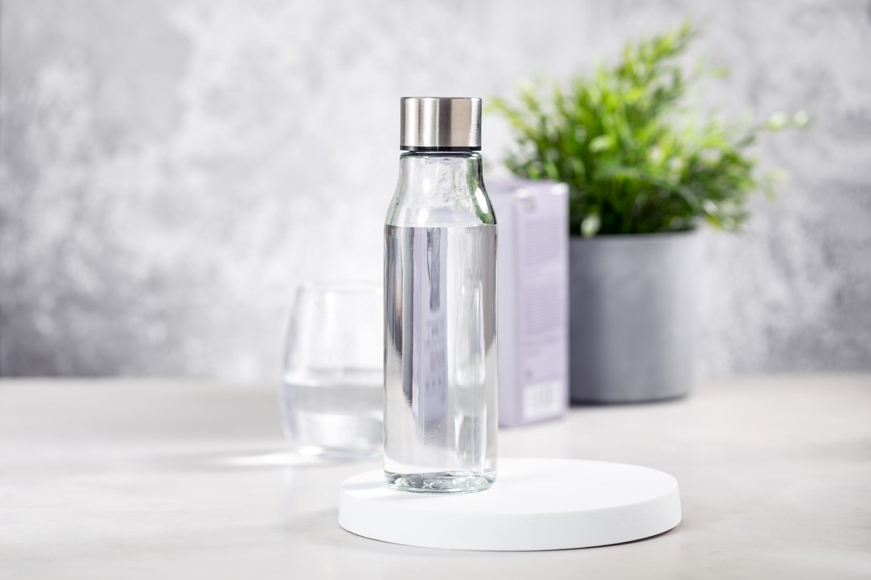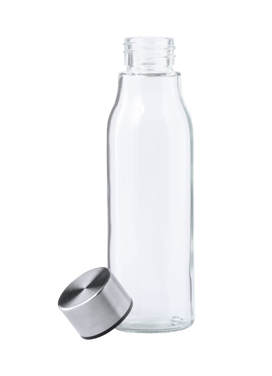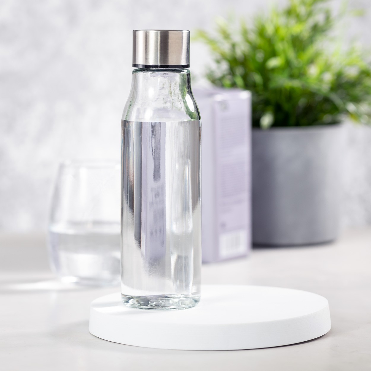 Sticlă sport, din sticlă borosilicată, cu capac din oțel inoxidabil, 550 ml. Nu este potrivit pentru băuturi carbogazoase.