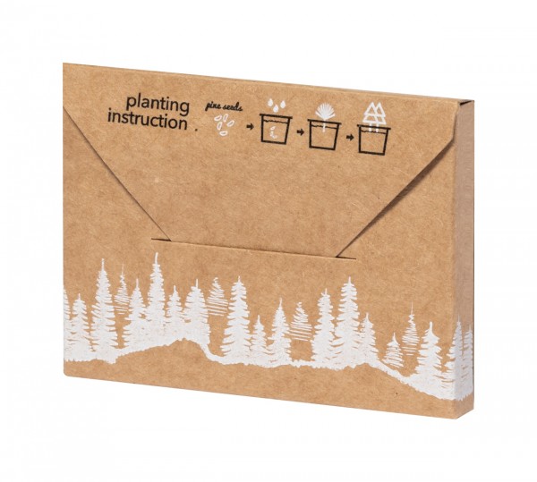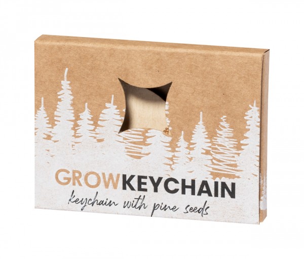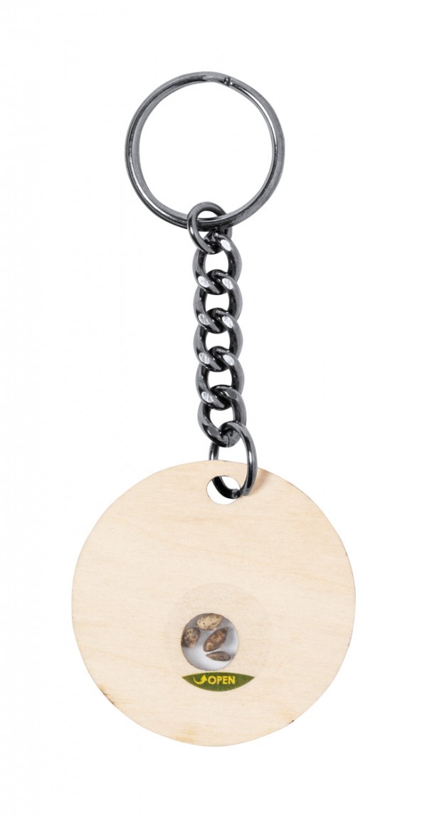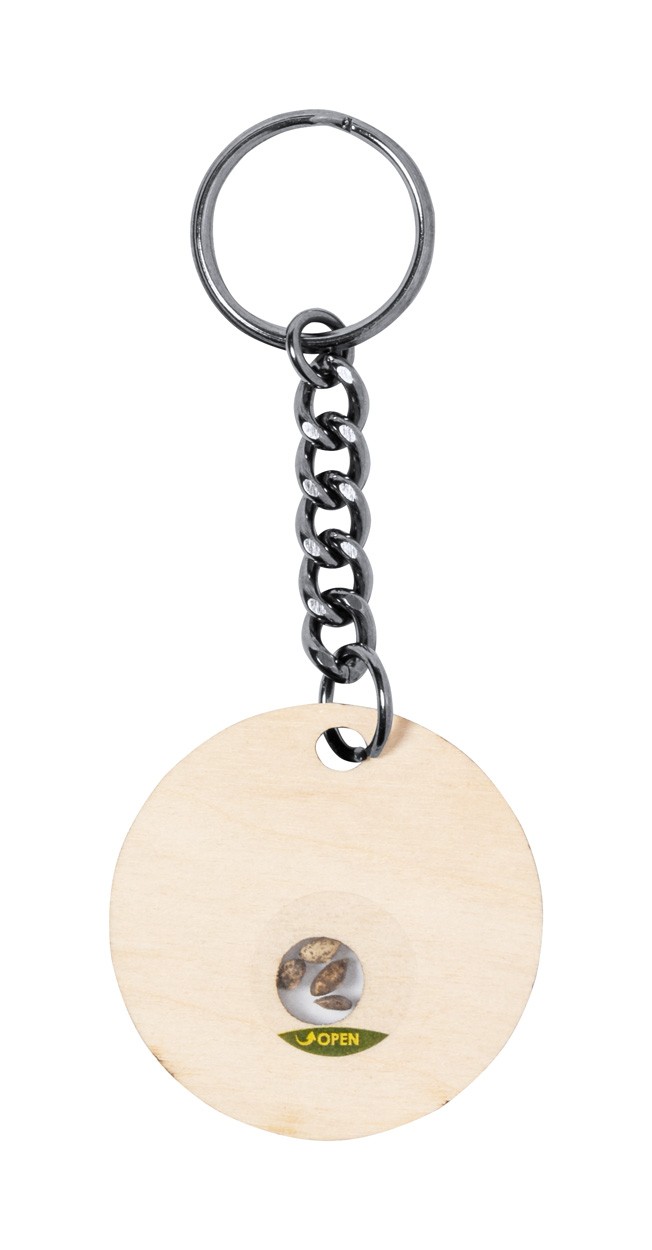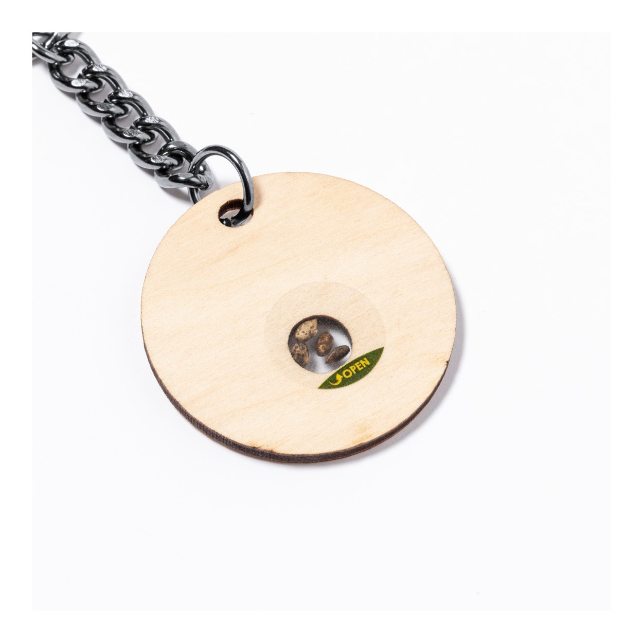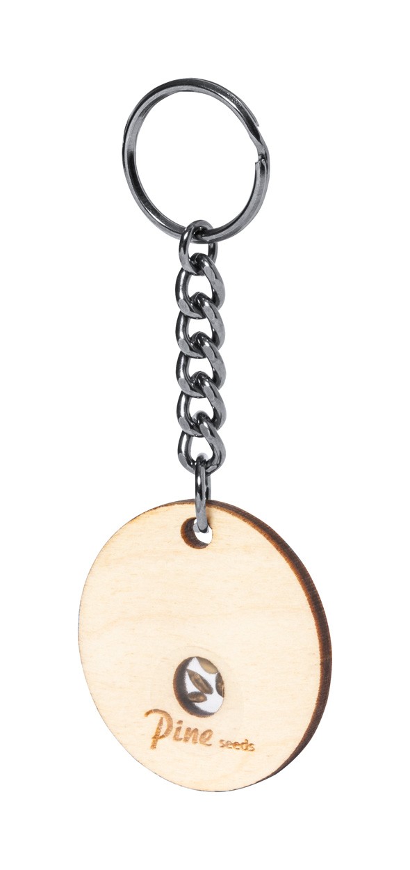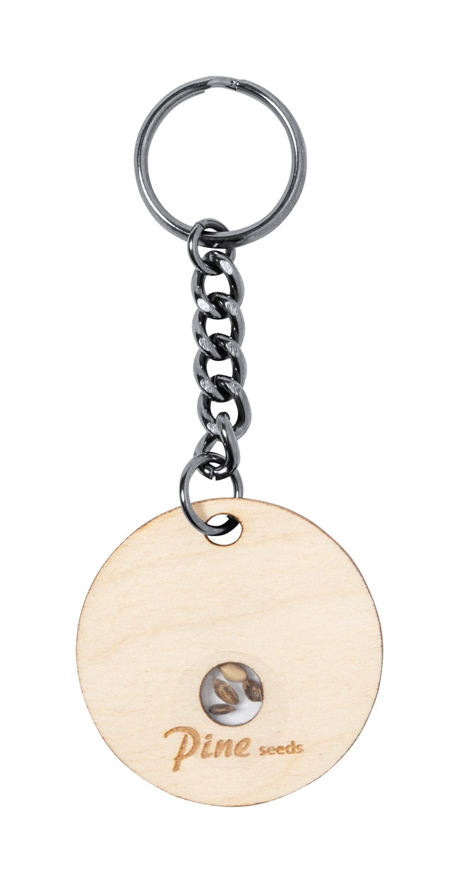Breloc din lemn, cu semințe de pin plantabile și inel metalic.