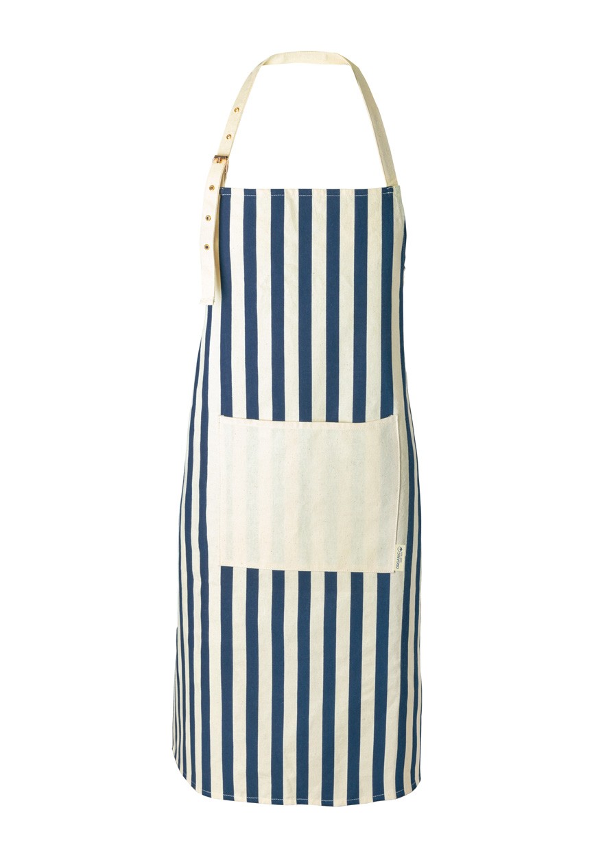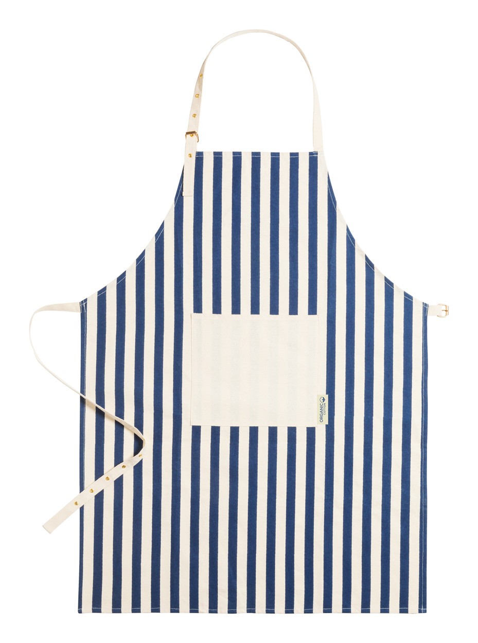 Șorț din bumbac organic, în dungi, cu buzunar frontal. Cu etichetă distinctivă din bumbac organic. 100% bumbac organic, 220 g/m².