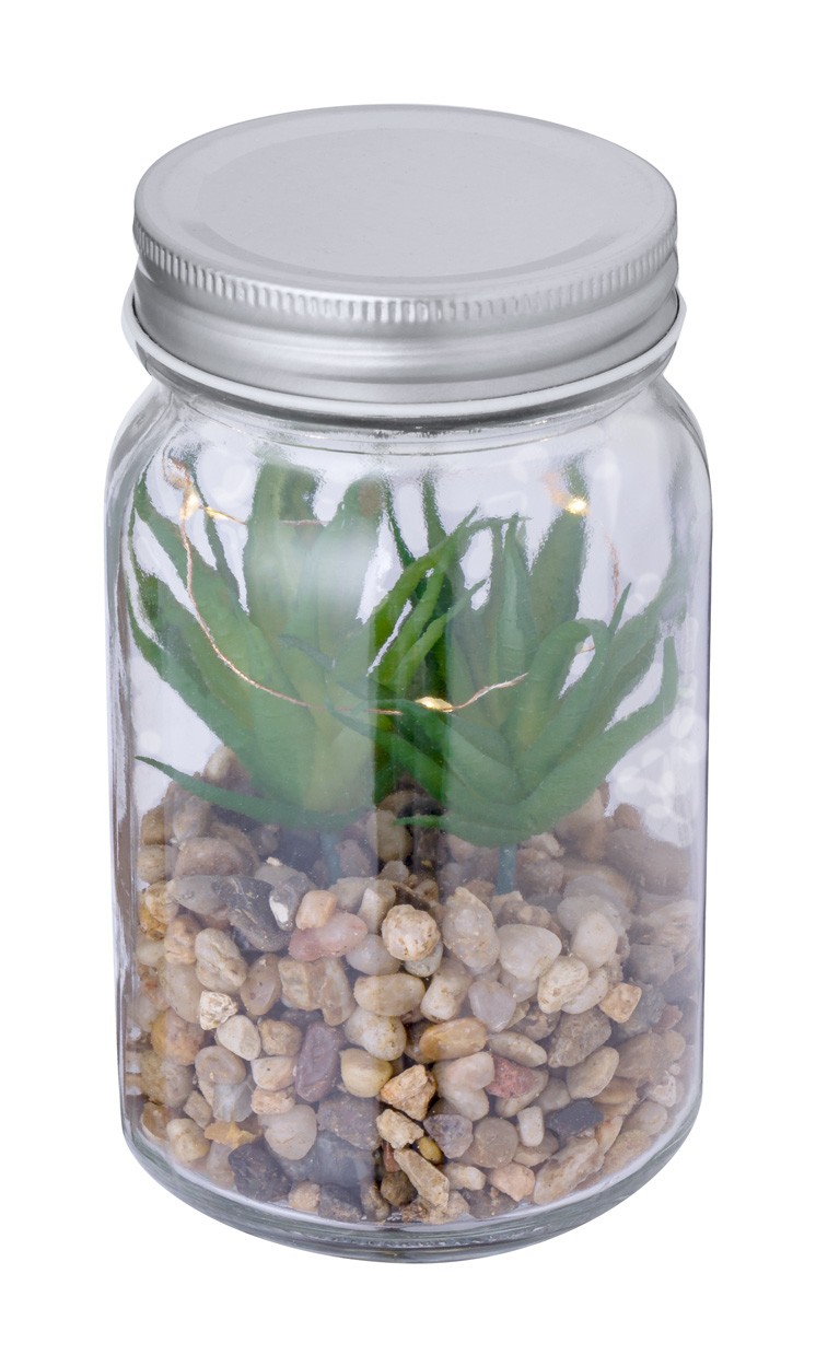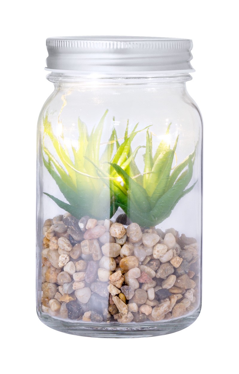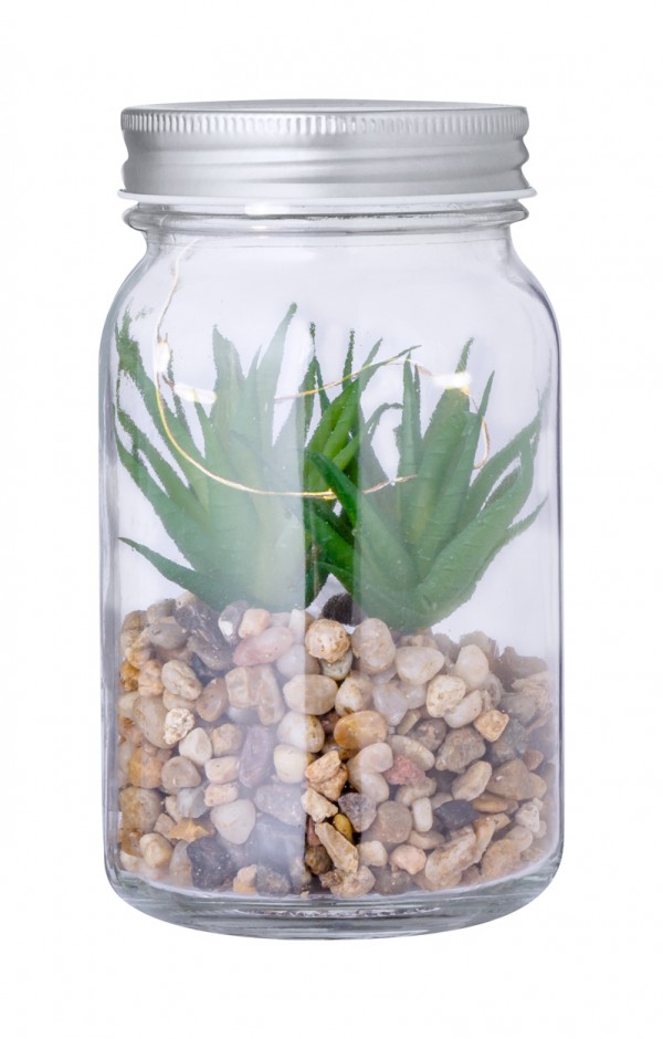Plantă decorativă, cu baza de piatră, în borcan din sticlă borosilicată, cu 5 LED-uri. Funcționează cu 3 baterii AAA, livrat fără baterii.