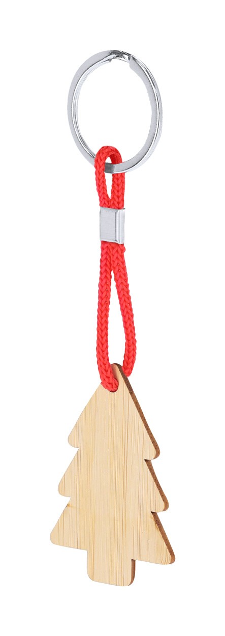 Breloc de Crăciun, din placaj de bambus, cu șnur roșu și inel metalic.