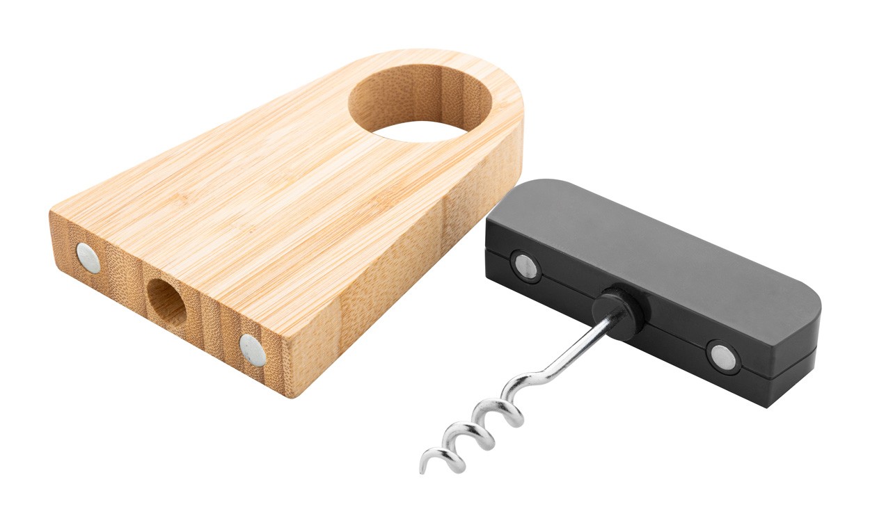 Suport pentru sticle de vin, din bambus și ABS reciclat, cu tirbușon din oțel inoxidabil.
