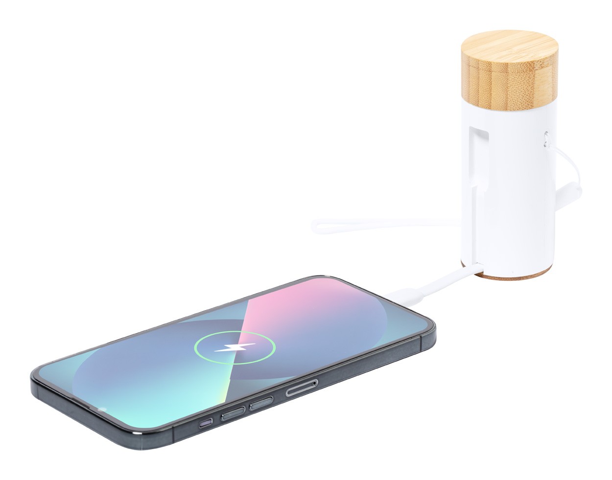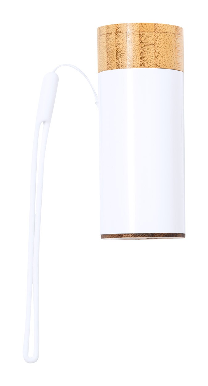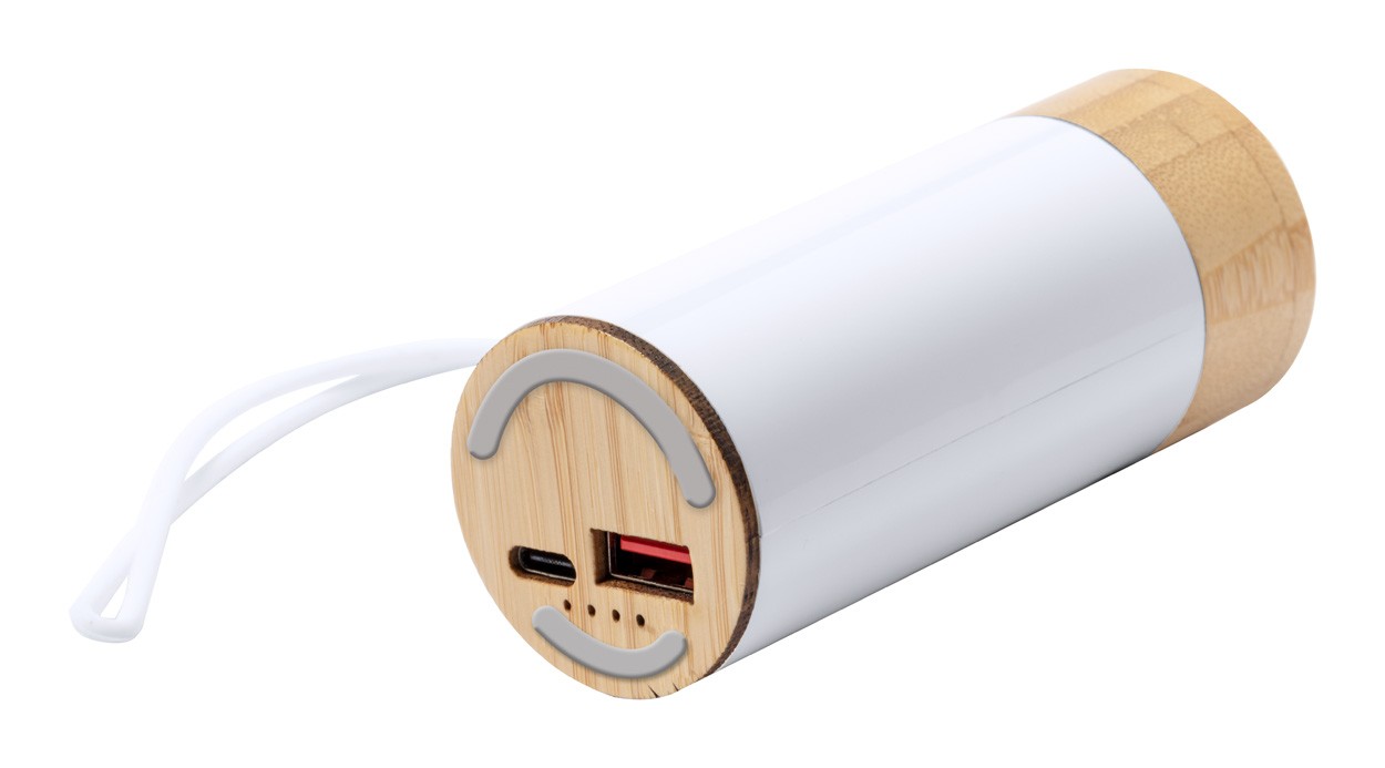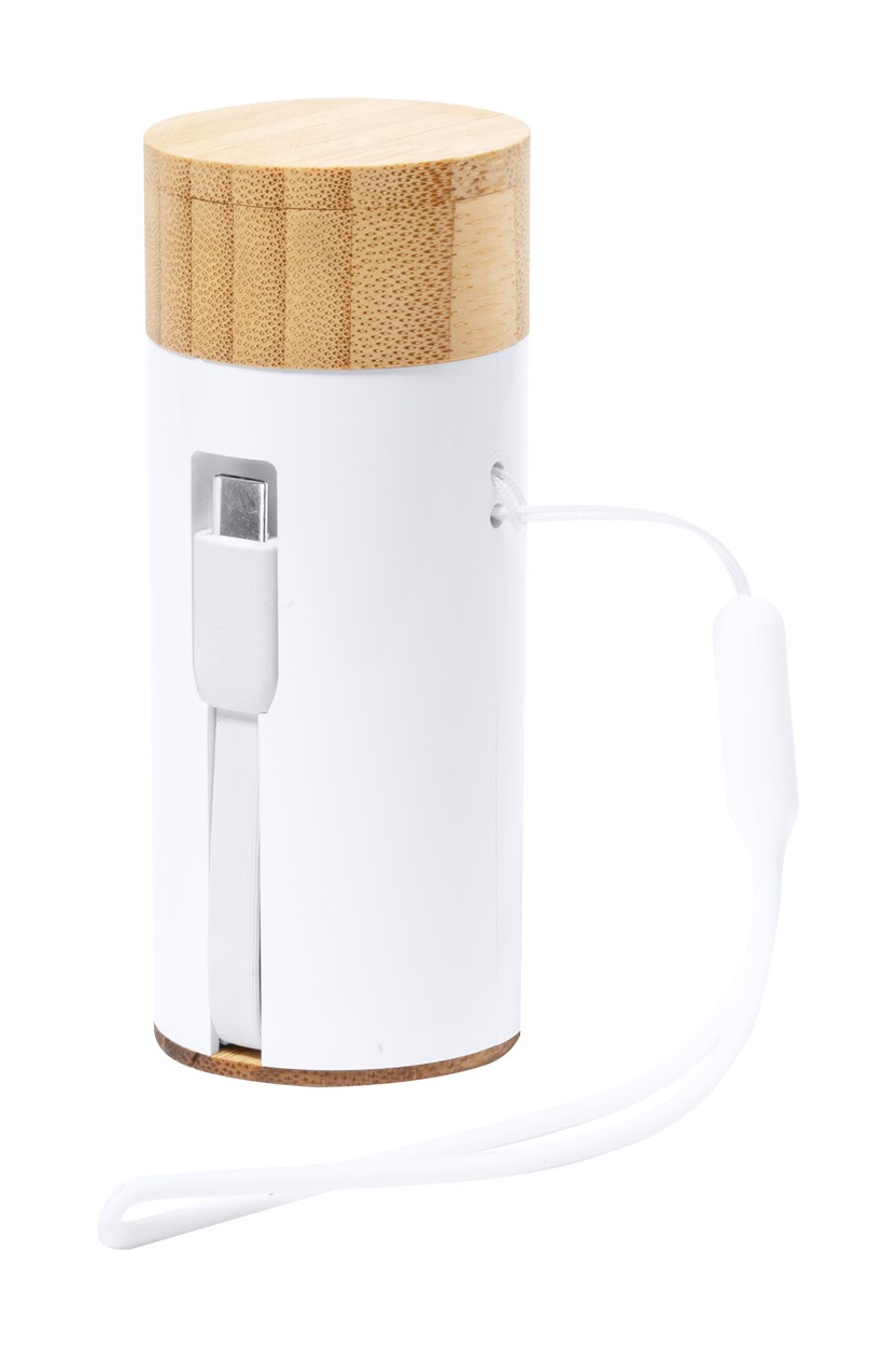 ABS plastic and bamboo power bank with 4500 mAh battery. Including bluetooth earphones with hands-free call function. Including USB charger cable.