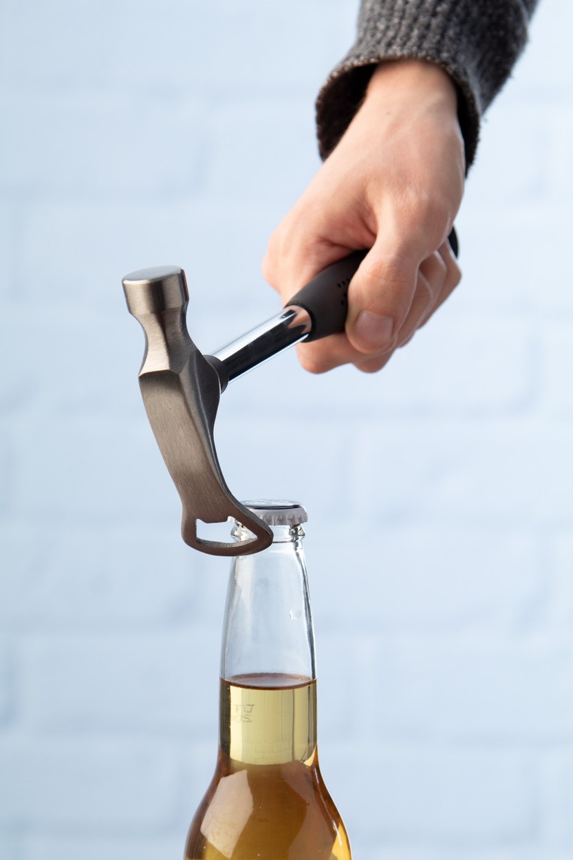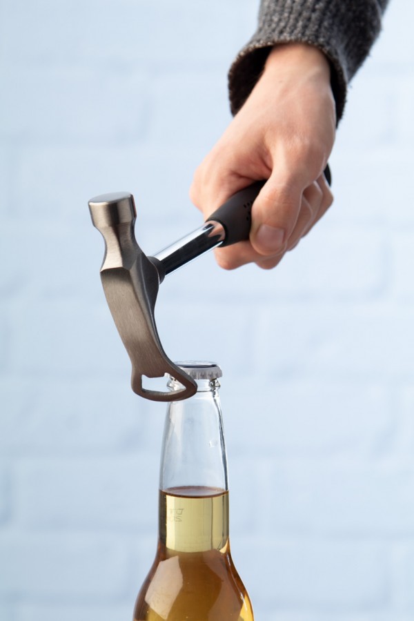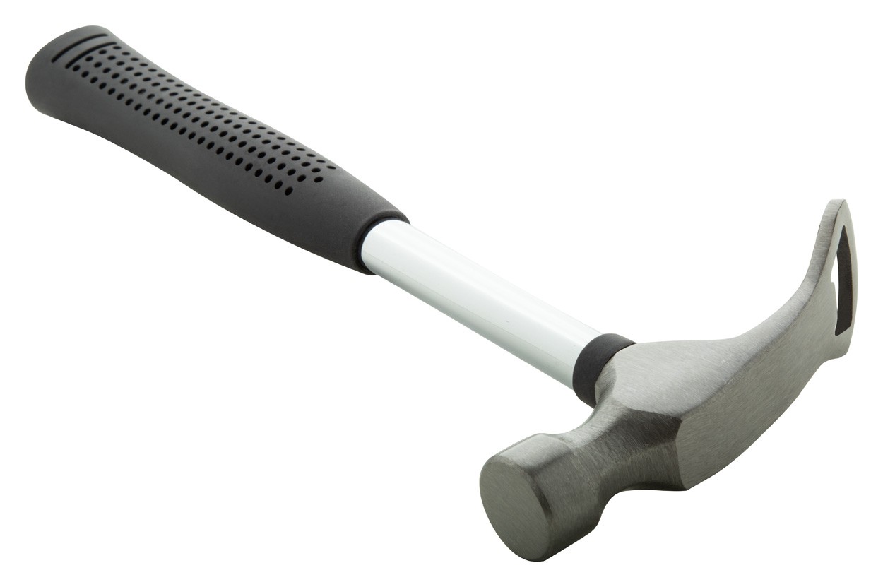 Ciocan din oțel carbon cu deschizător de sticle și mâner de cauciuc.
