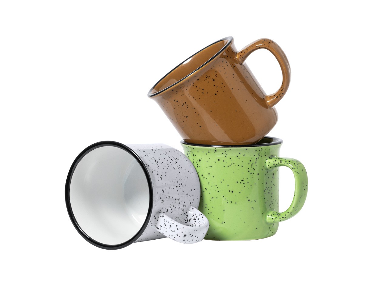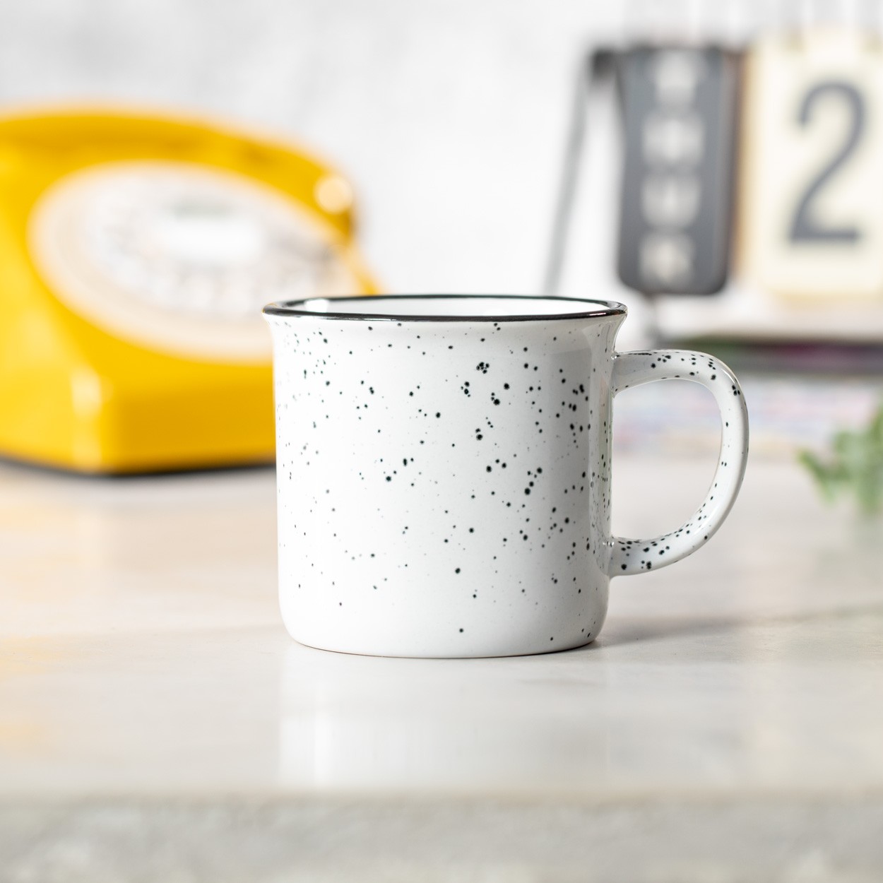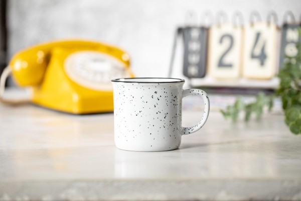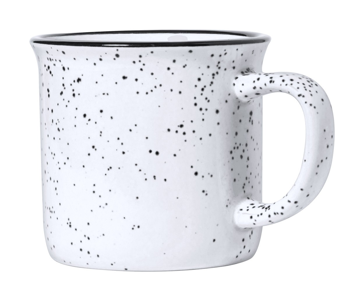 Cană vintage din ceramică, cu margine neagră si puncte mici la exterior, 350 ml. În cutie de hârtie kraft.