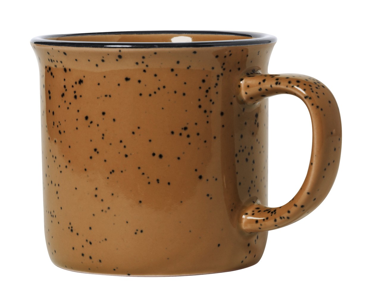 Cană vintage din ceramică, cu margine neagră si puncte mici la exterior, 350 ml. În cutie de hârtie kraft.