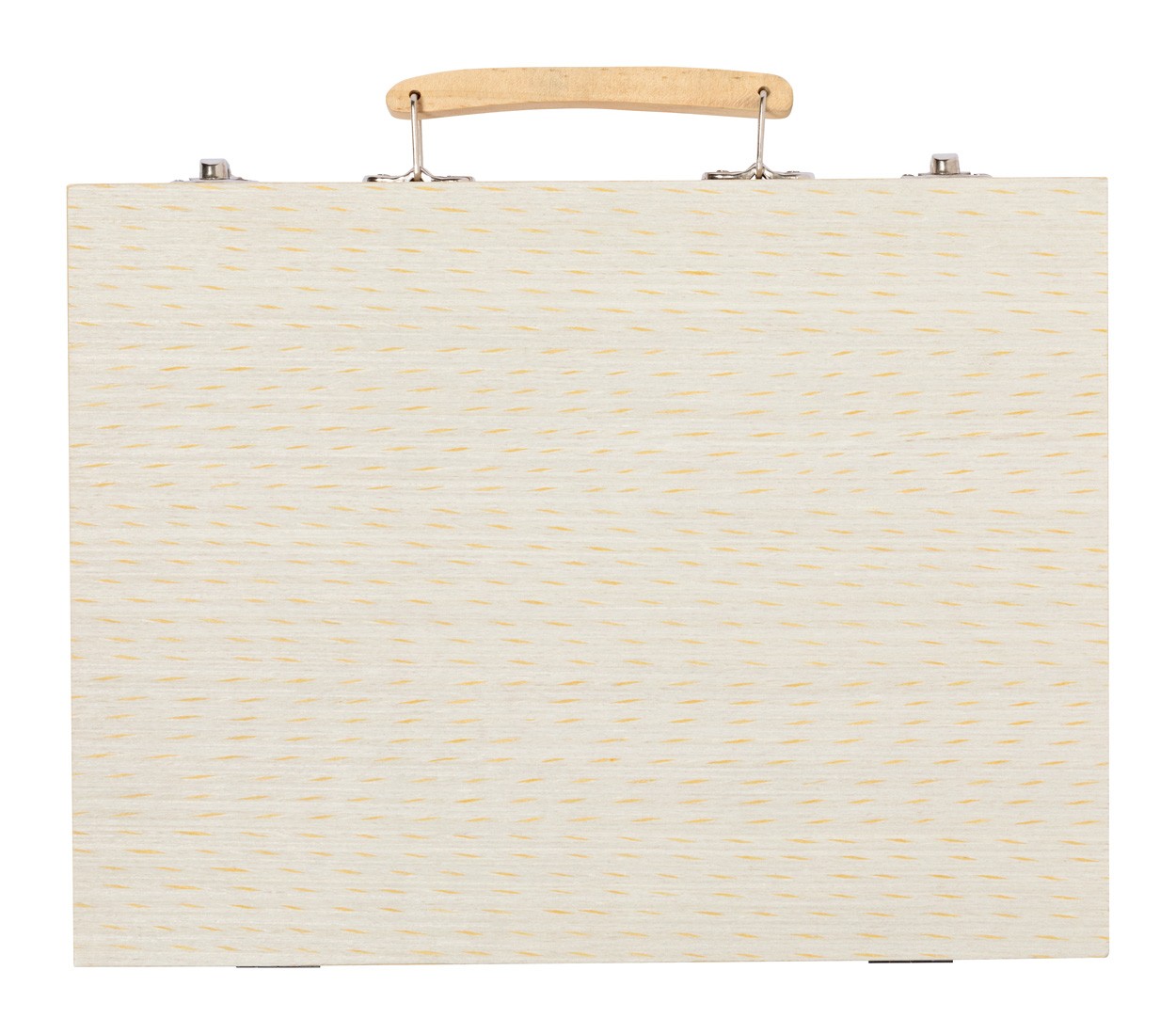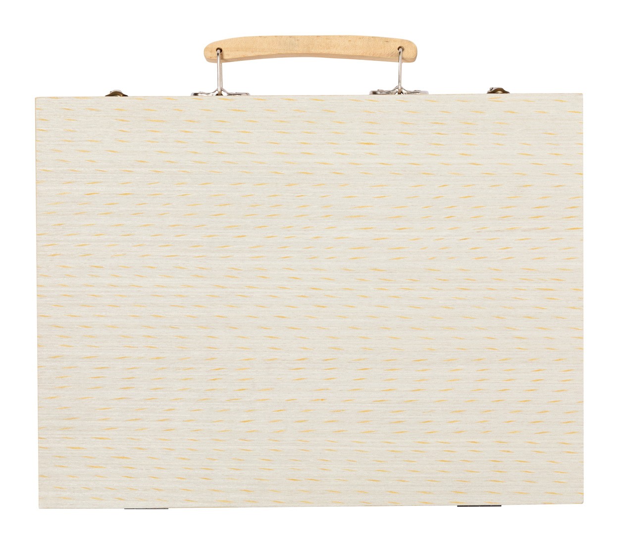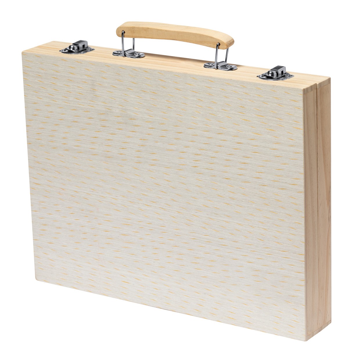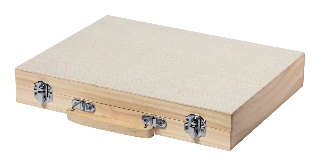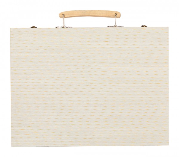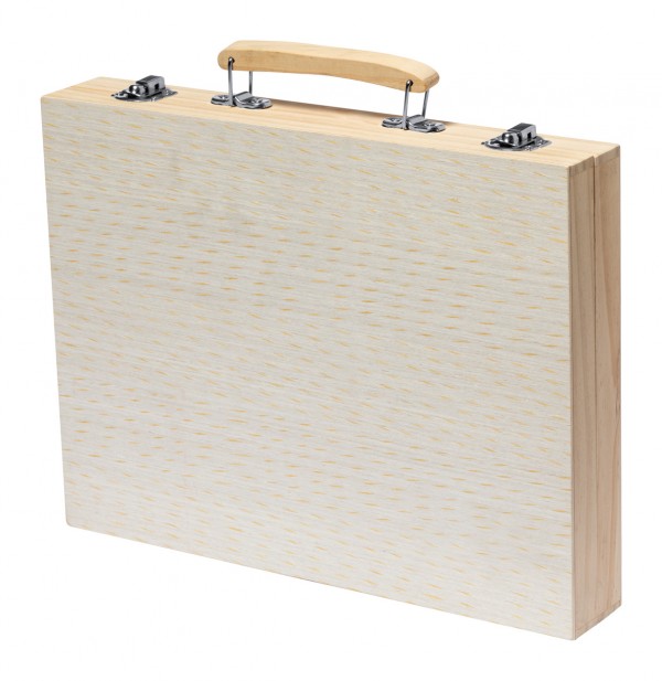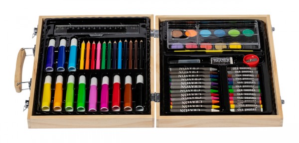 Set de colorat, 66 buc, în carcasă din lemn cu mâner. Include markere, creioane grafice, creioane colorate, creioane cu ulei, pensulă și paletă pentru acuarelă, ascuțitoare, radieră, riglă și lipici