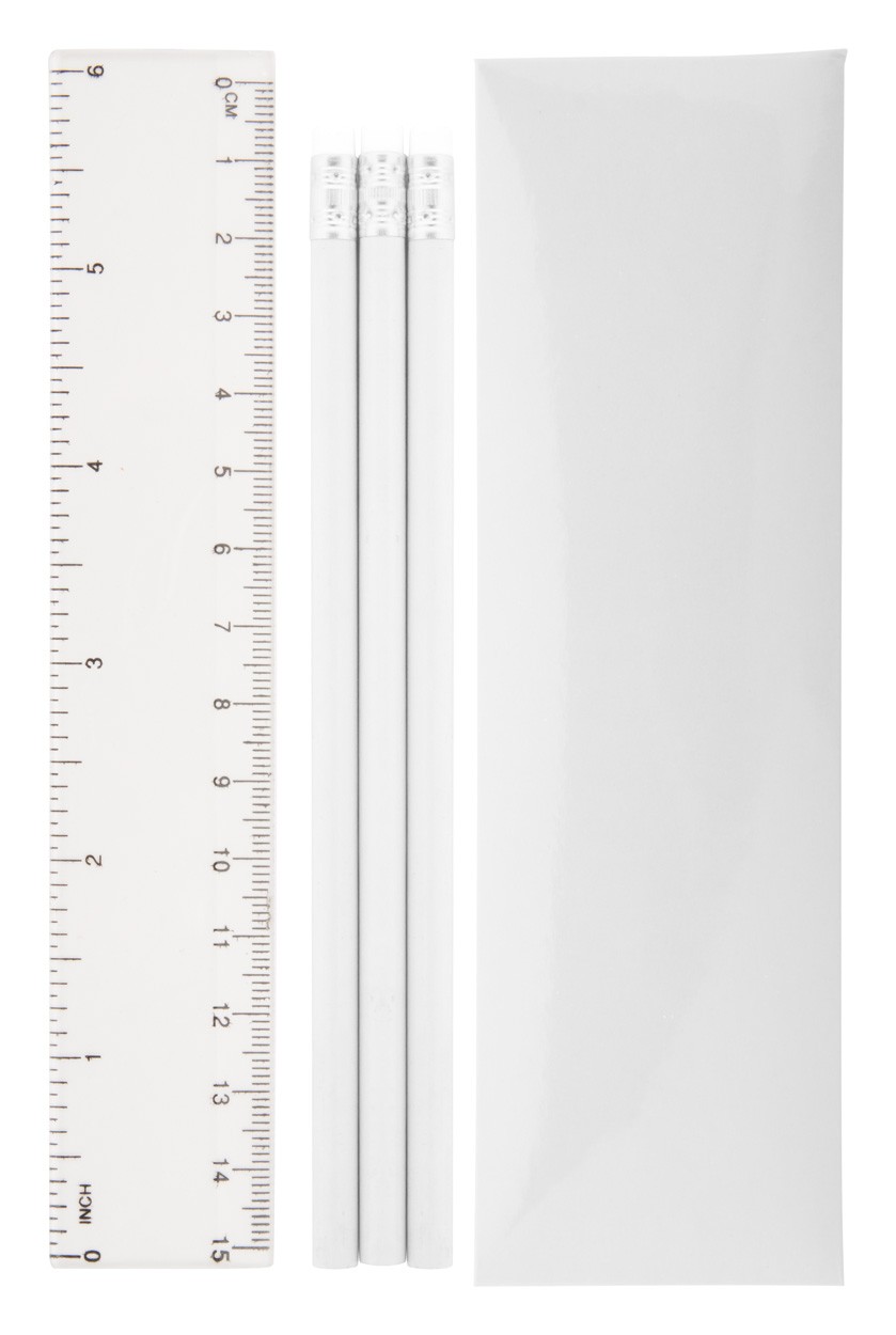 Set cu 3 creioane din lemn și o riglă din plastic, în cutie de carton.