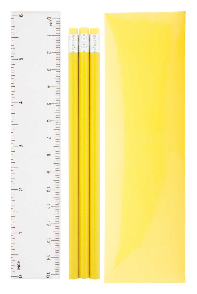 Set cu 3 creioane din lemn și o riglă din plastic, în cutie de carton.