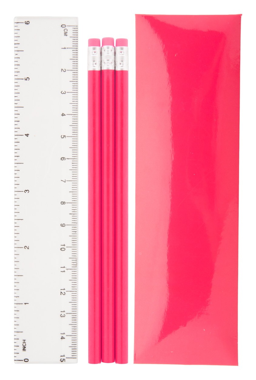 Set cu 3 creioane din lemn și o riglă din plastic, în cutie de carton.