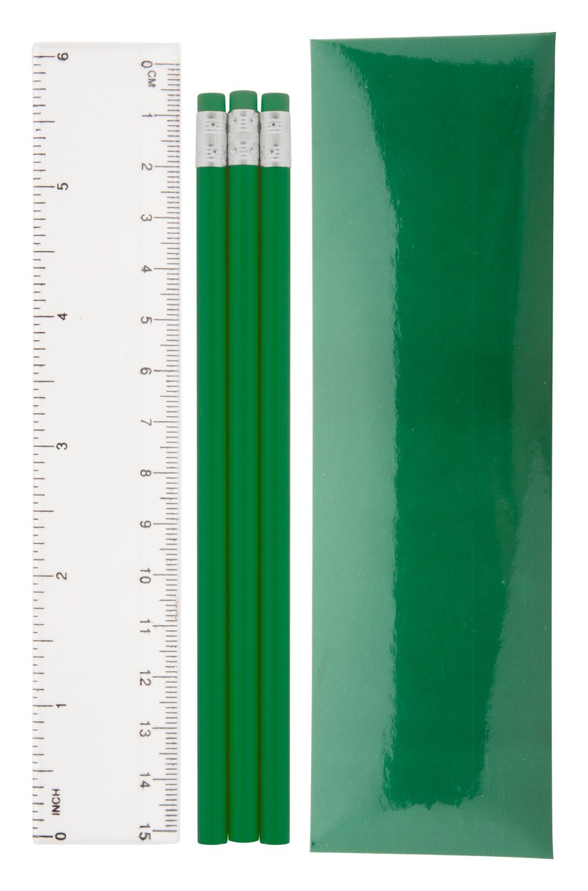 Set cu 3 creioane din lemn și o riglă din plastic, în cutie de carton.