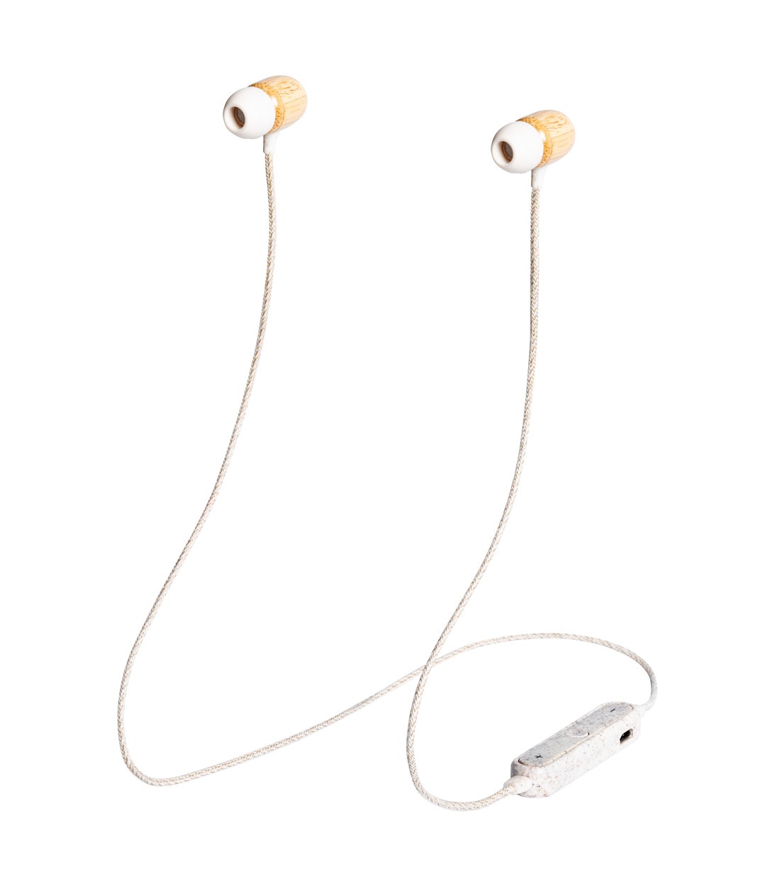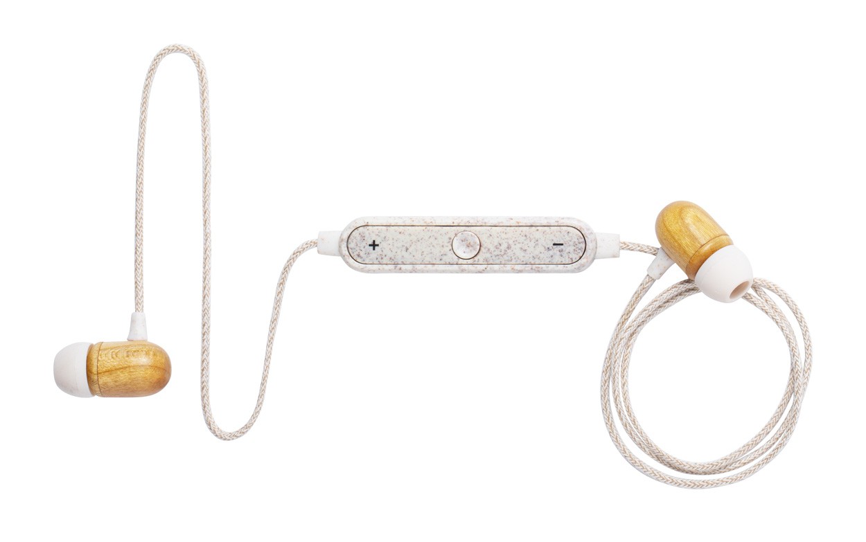 Căști intra-auriculare Bluetooth din bambus, carcasă din plastic din paie de grâu și cablu acoperit cu cânepă. Cu funcție de apelare hands-free și baterie reîncărcabilă încorporată. Cu cablu încărcător USB.
