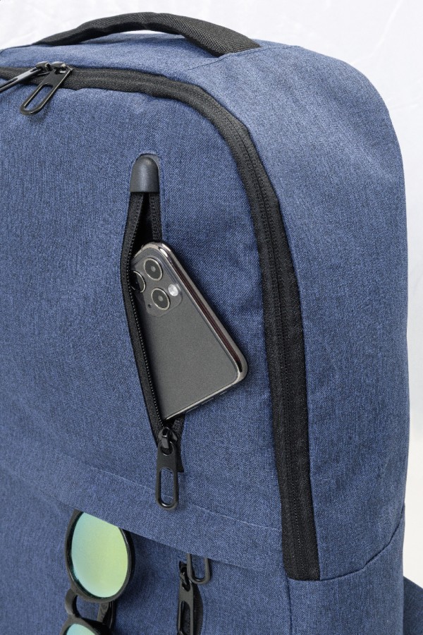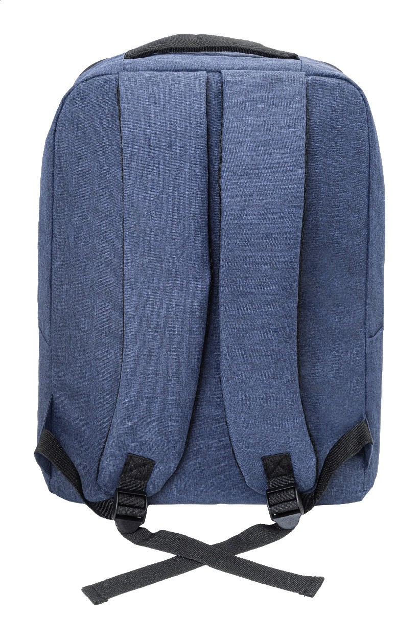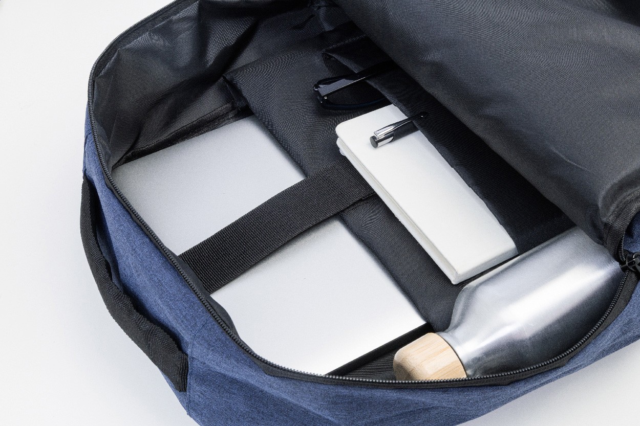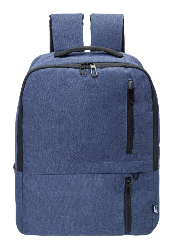 Rucsac din RPET, cu compartiment principal cu fermoar și 3 buzunare frontale cu fermoar. Cu compartimente căptușite pentru tabletă (10") și laptop (15"), bretele căptușite pentru spate și umăr. Poliester RPET 600D, cu etichetă distinctivă RPET.