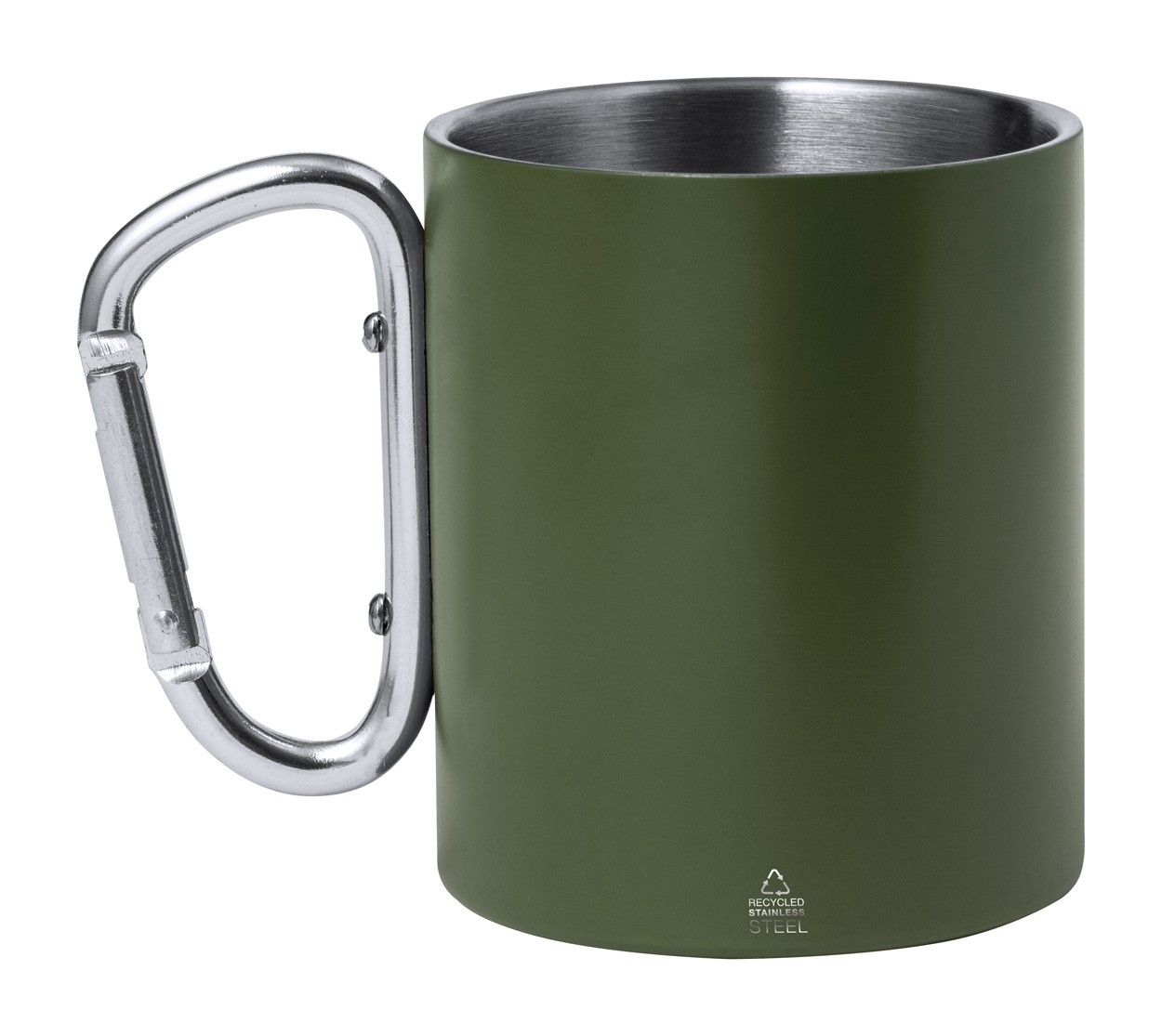 Cană termică din oțel inoxidabil reciclat, cu perete dublu, cu mâner carabină din aluminiu reciclat. 300 ml. În cutie de hârtie kraft.