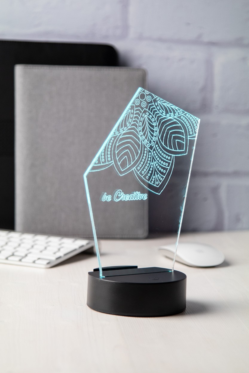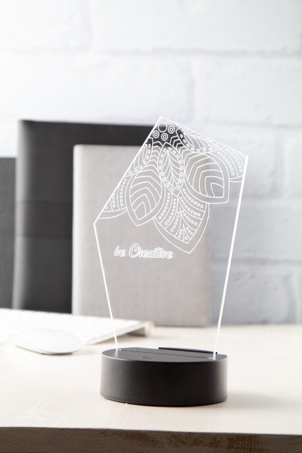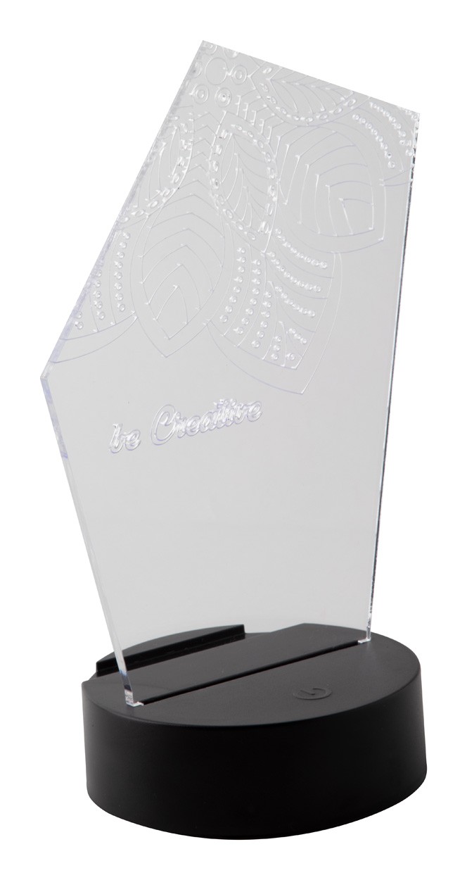 Trofeu acrilic personalizat cu LED multicolor. Funcționează cu 3 baterii AA. Prețul include imprimarea cu gravură. Cantitate minimă de comandă: 25 buc.