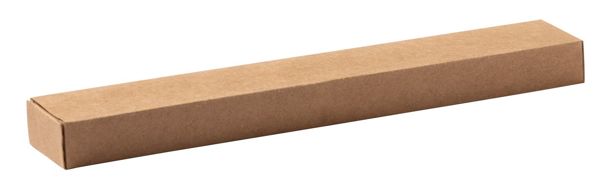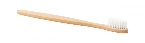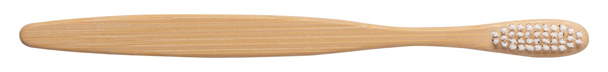 Periuță de dinți din bambus cu peri albe, în cutie de hârtie kraft.