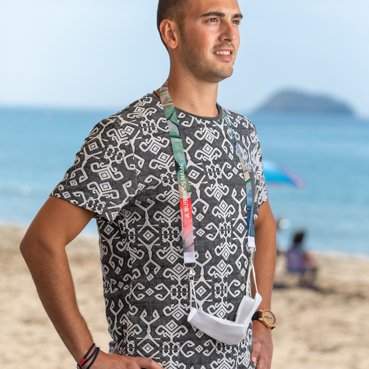 Lanyard pentru masca faciala, din poliester, cu doua carabine din metal.