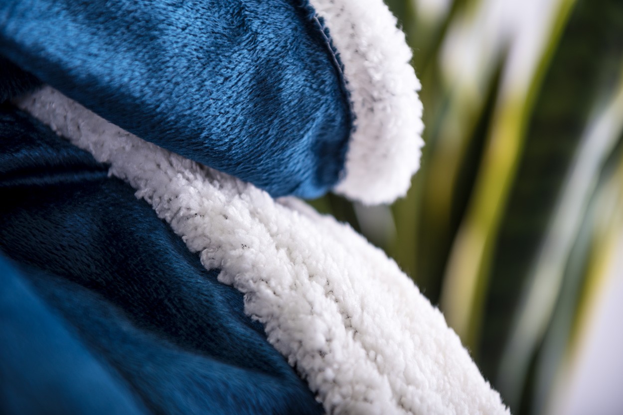 Pătură cu două straturi din lână și sherpa, 380 g/m². Înfășurat în panglică și card cartonat imprimabil atașat.