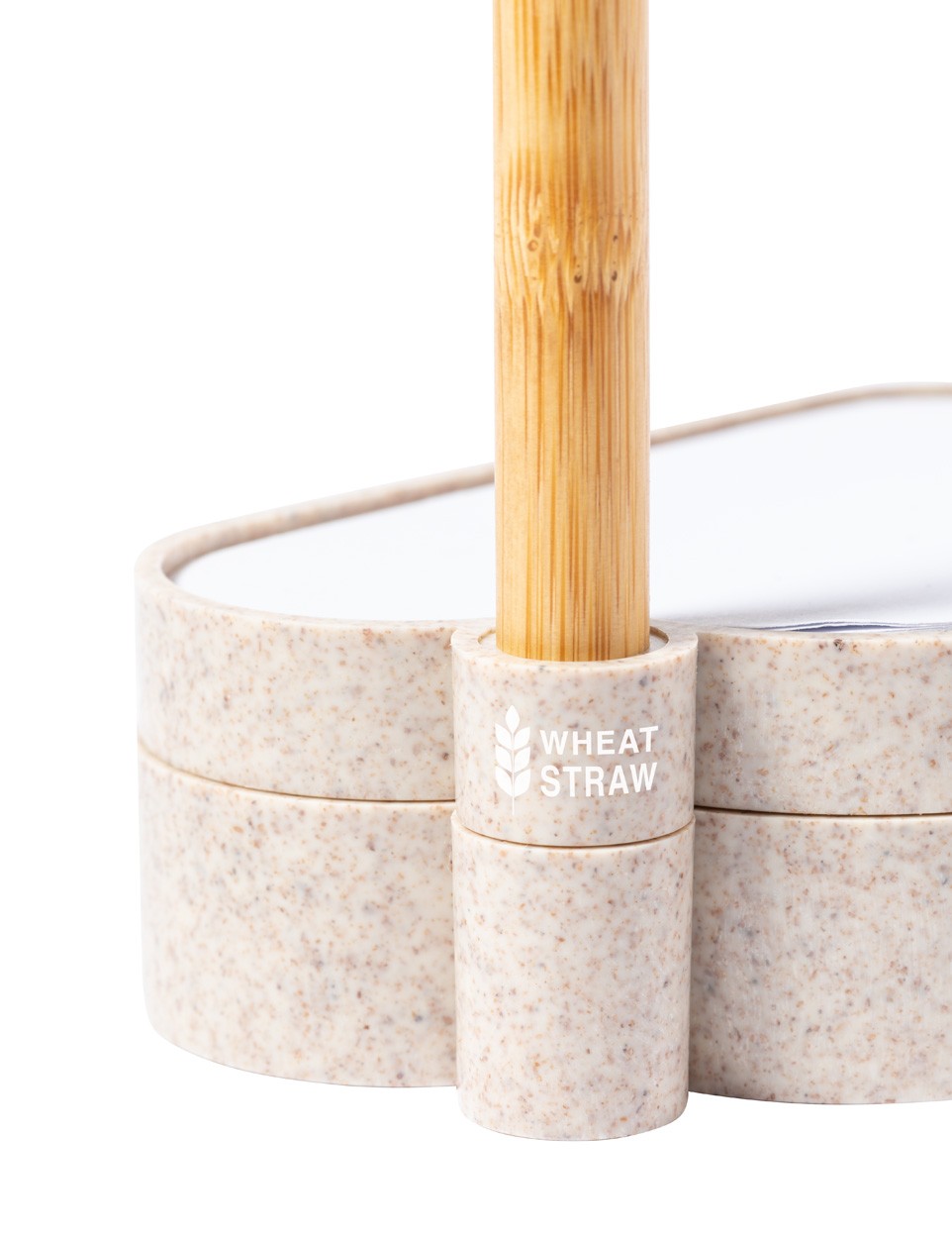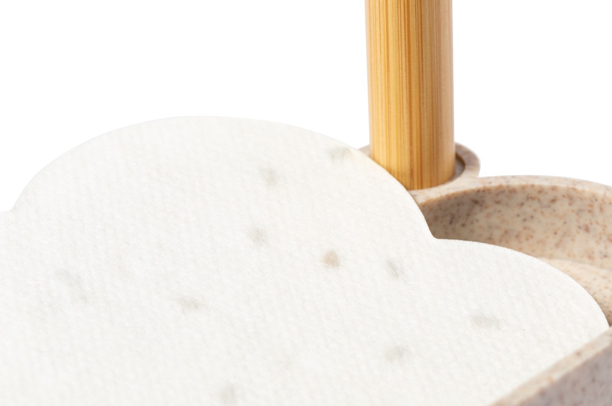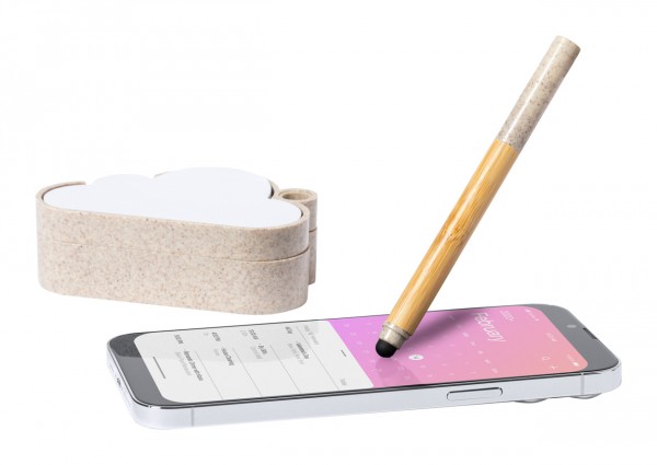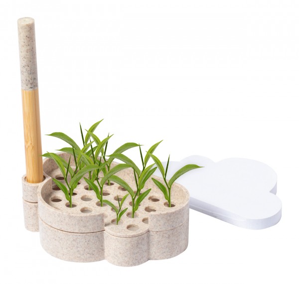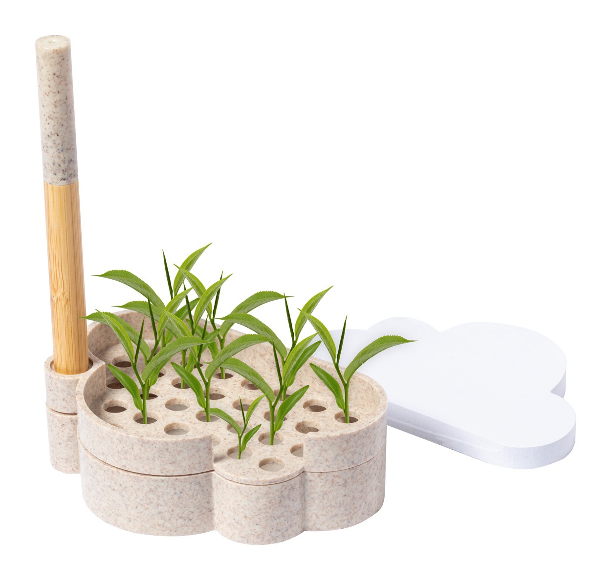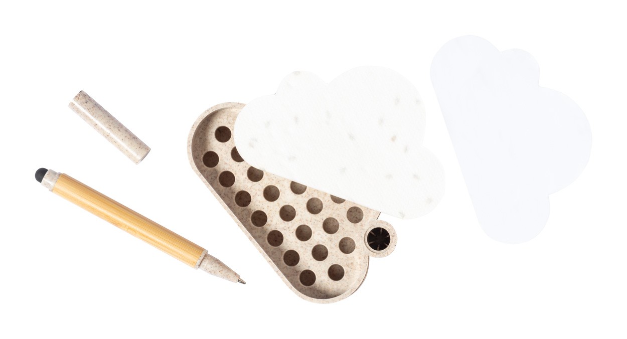 Carnet în formă de nor, cu 80 de note de hârtie în formă de nor. Într-un suport pentru blocnotes din plastic din paie de grâu, cu două compartimente. Cu o foaie de hârtie cu semințe și un pix din plastic din bambus și paie de grâu cu capac și mină albastră. Capacul din hârtie pentru semințe conține semințe asortate de flori sălbatice, care pot fi plantate.