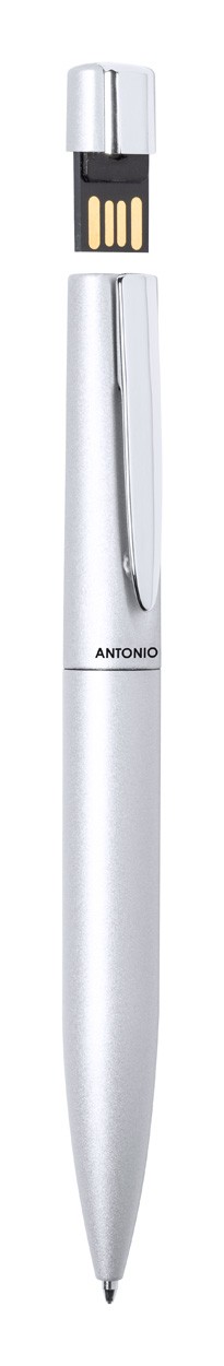 Pix rotund, din metal și plastic ABS, cu finisaj mat, clemă metalică și unitate flash USB de 32 GB. În cutie cadou neagră. Cu mină albastră. Produs marca Antonio Miro.