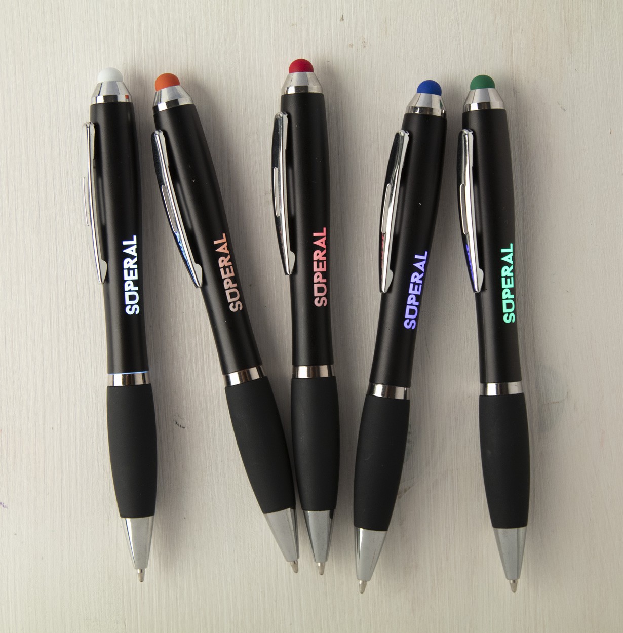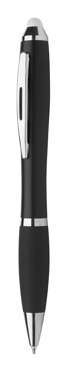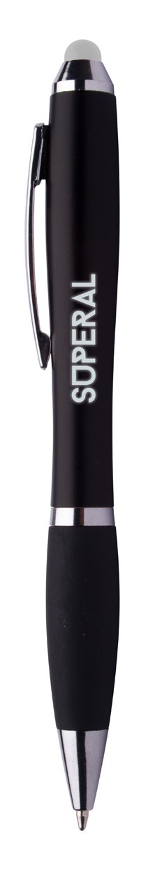 Pix negru din plastic, cu touch, dispozitiv de prindere cauciucat, cu LED colorat pentru gravură iluminată. Lumina poate fi activată prin apăsarea butonului. Se livrează cu baterie, mină albastră.